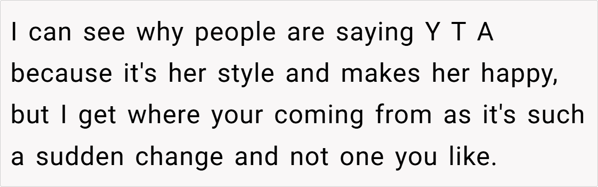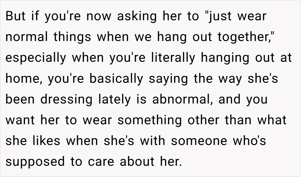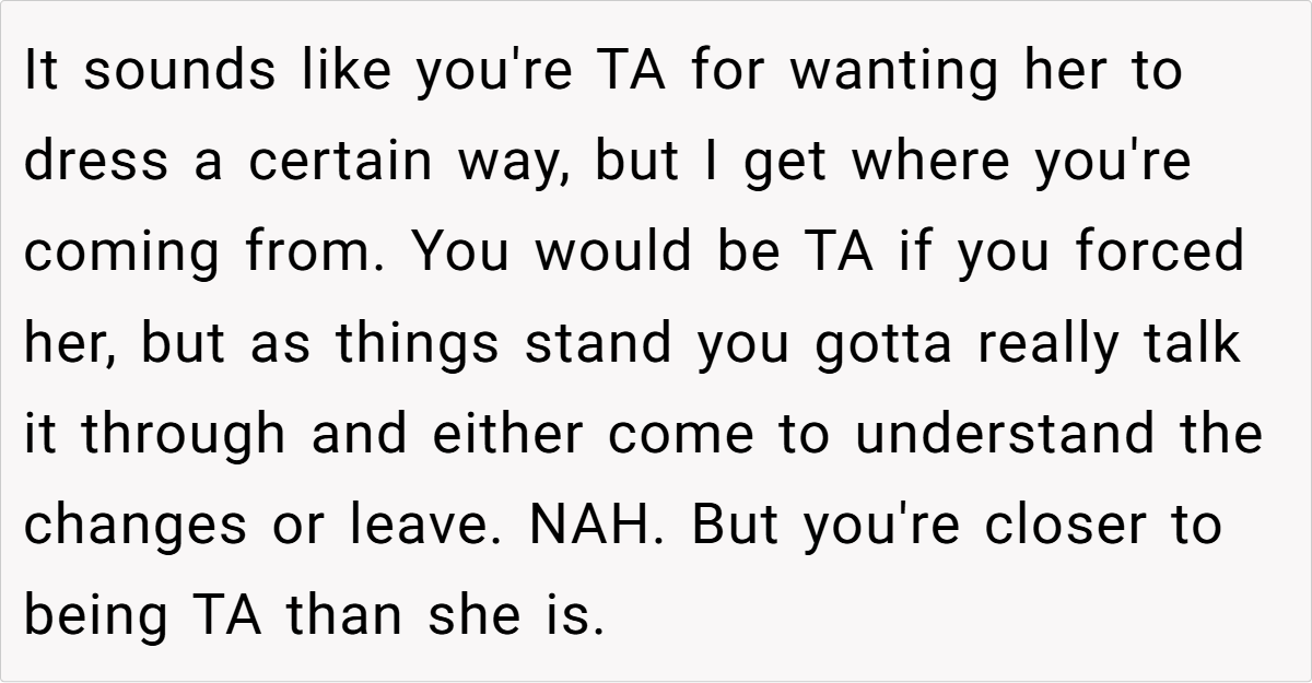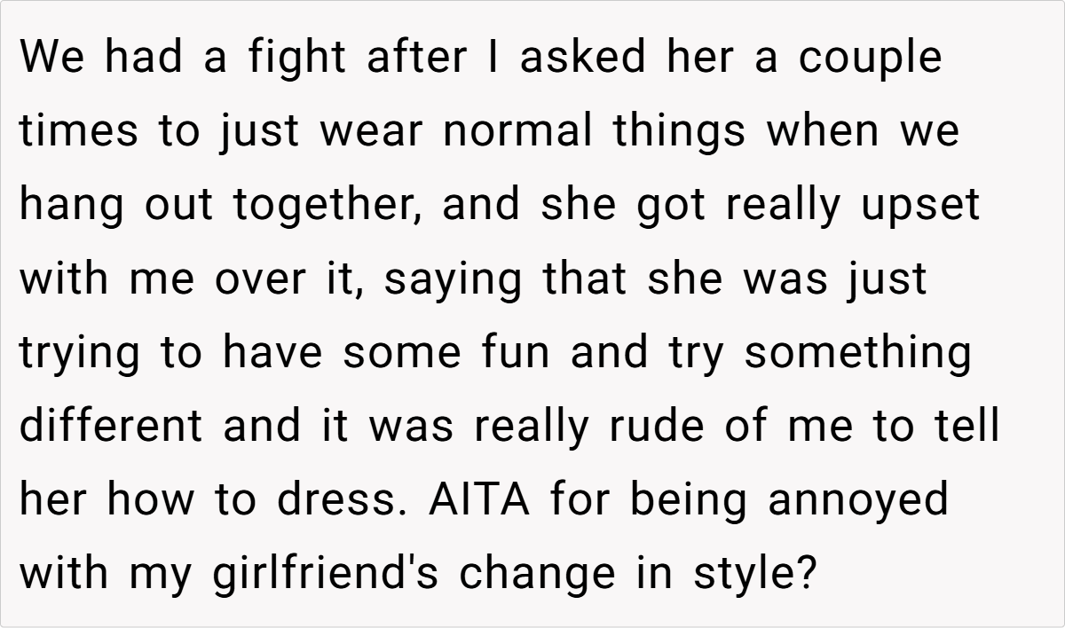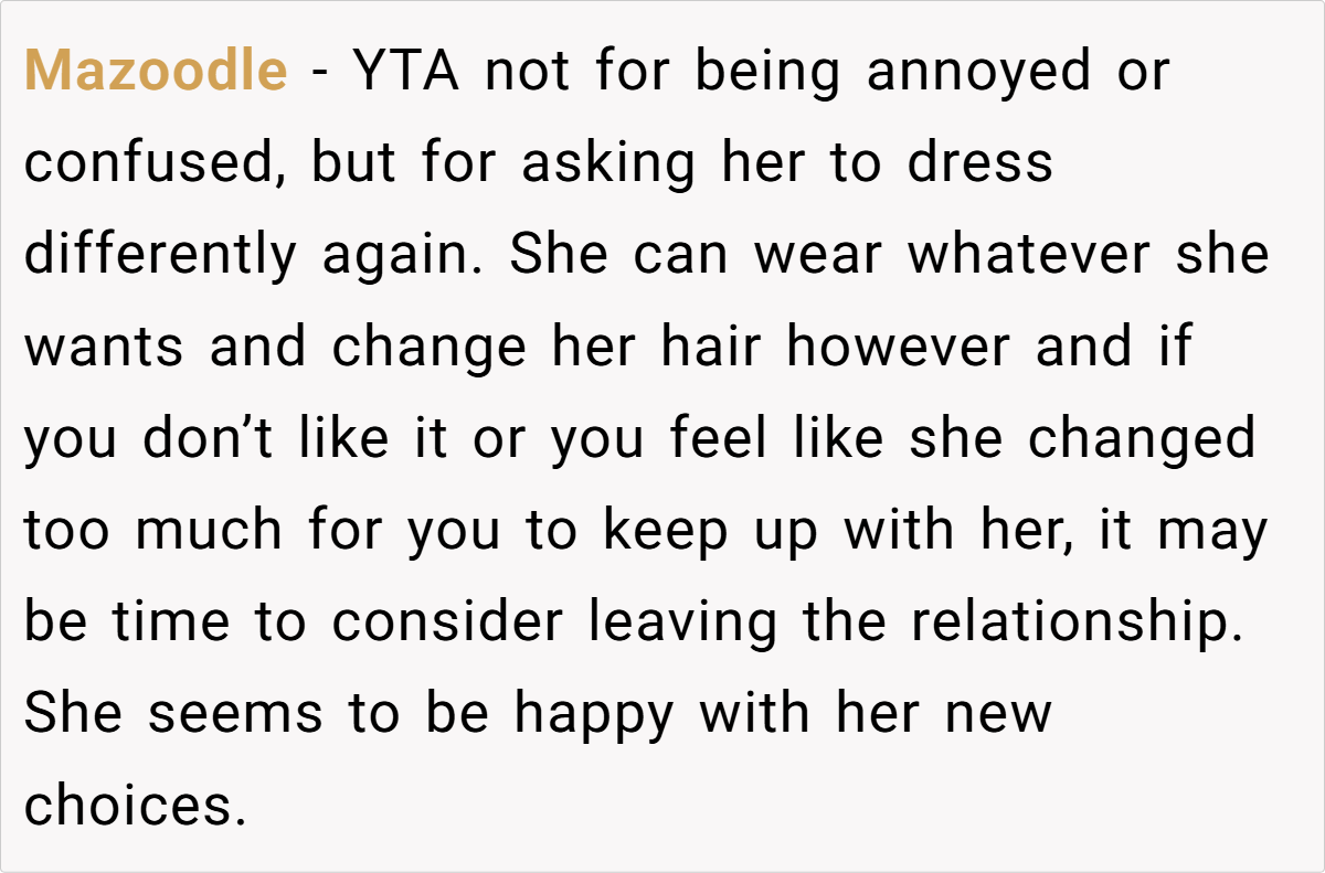 For OP’s girlfriend, her new style isn’t just a phase—it’s her feeling free to be herself without outside judgment. Instead of dressing to fit expectations, she’s dressing to reflect who she really is. OP’s discomfort may stem from the fact that the person he thought he knew has evolved in ways he didn’t anticipate.