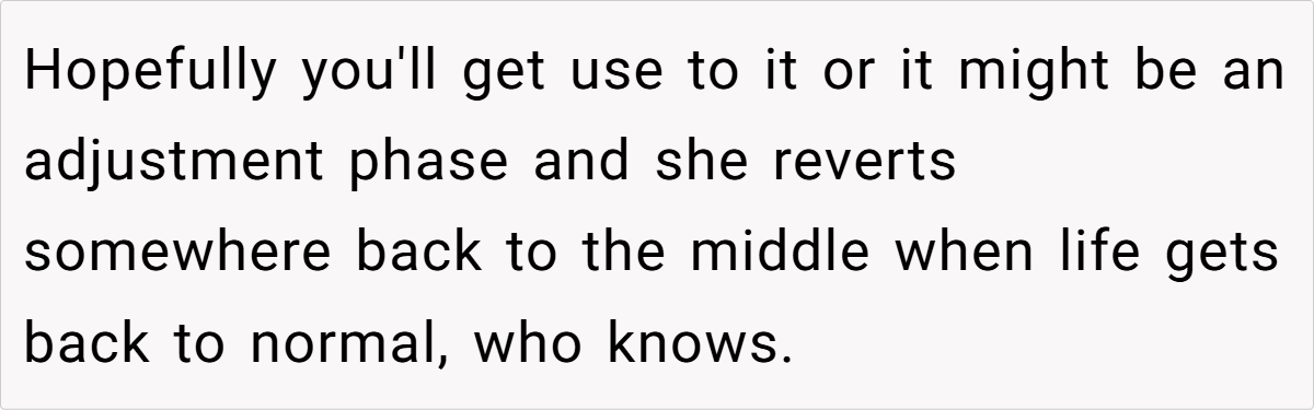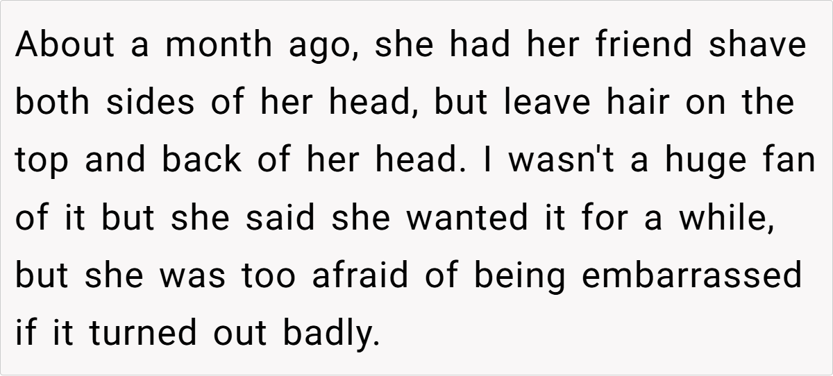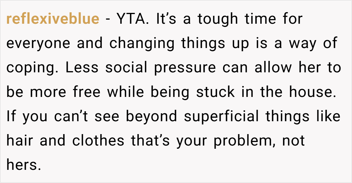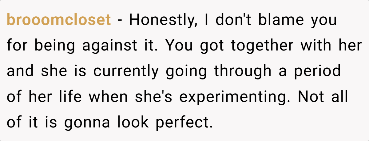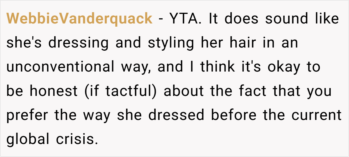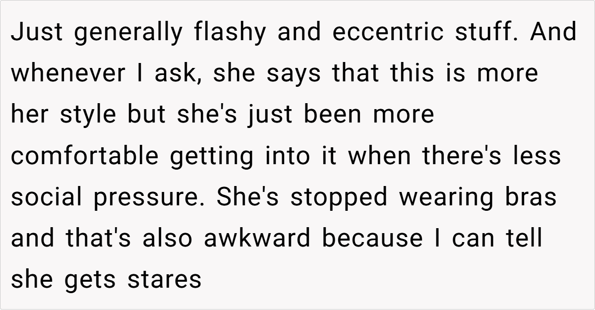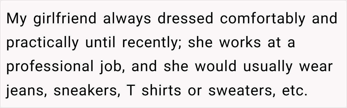 For OP’s girlfriend, her new style isn’t just a phase—it’s her feeling free to be herself without outside judgment. Instead of dressing to fit expectations, she’s dressing to reflect who she really is. OP’s discomfort may stem from the fact that the person he thought he knew has evolved in ways he didn’t anticipate.