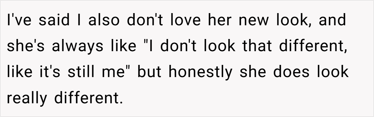 Dr. Vivian Diller, author of Face It: What Women Really Feel As Their Looks Change, explains that dramatic changes in appearance can trigger a sense of unfamiliarity in long-term relationships. People often associate their partner’s look with who they are, so when that changes suddenly, it can feel like they’re with a completely different person.