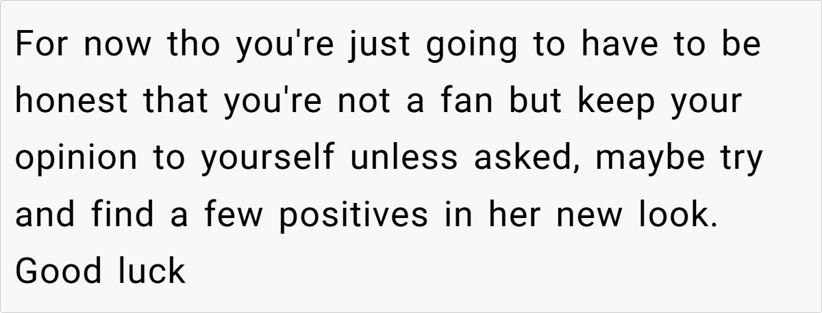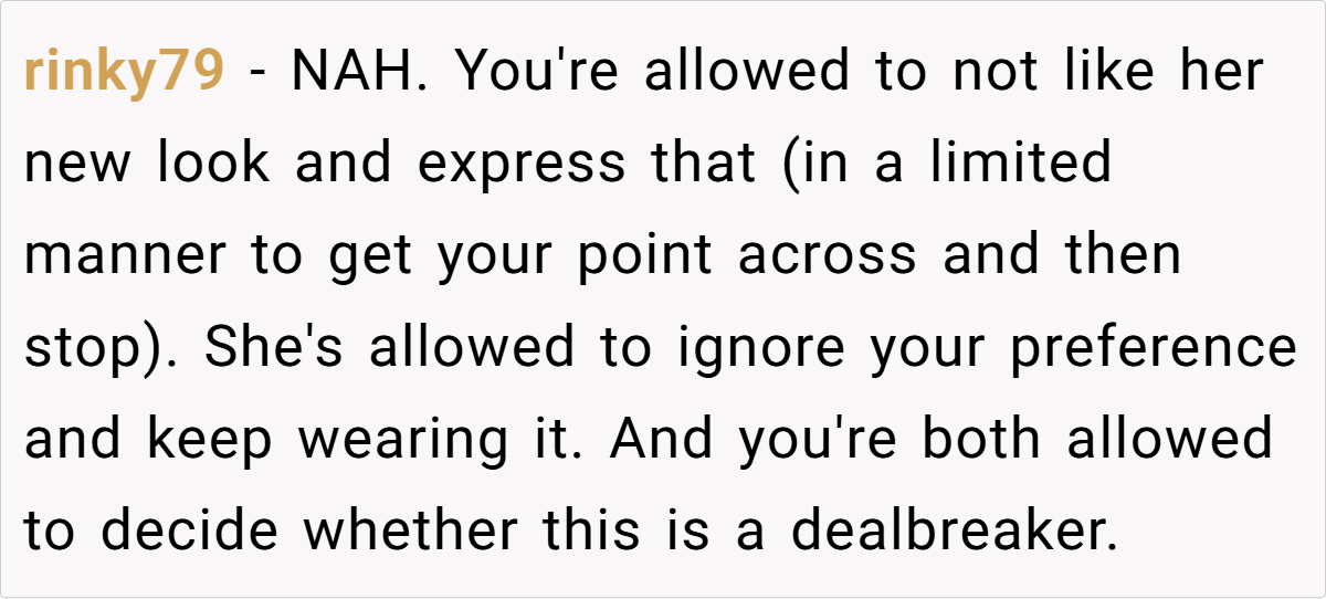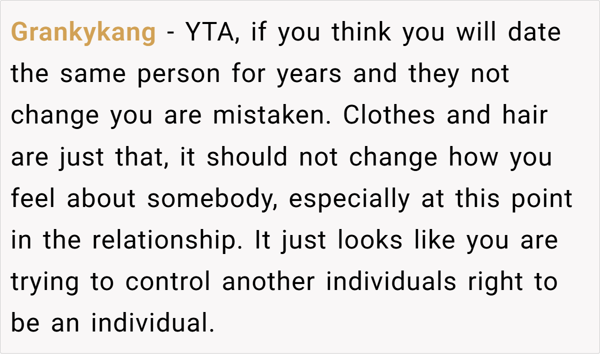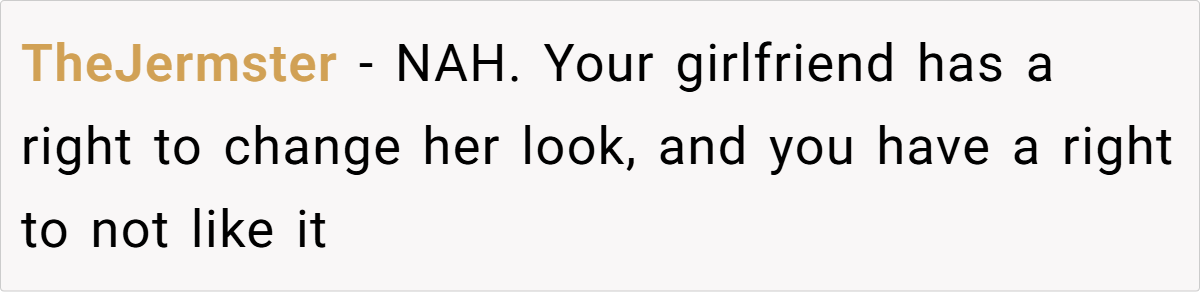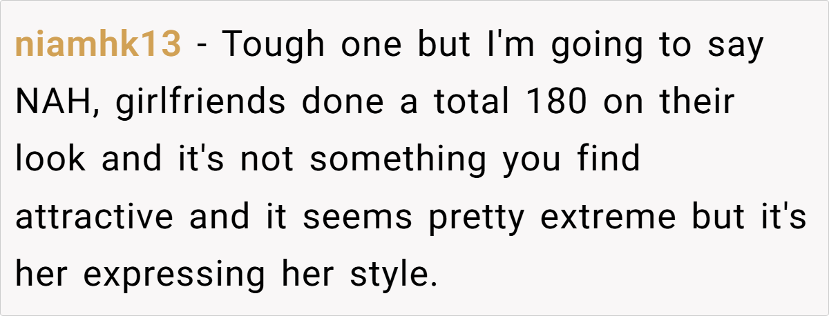 The majority of Redditors believe OP is in the wrong—not for feeling surprised by his girlfriend’s transformation, but for expecting her to change back to fit his comfort. Style is personal, and in relationships, it’s important to support each other’s growth rather than hold onto past versions of a person.