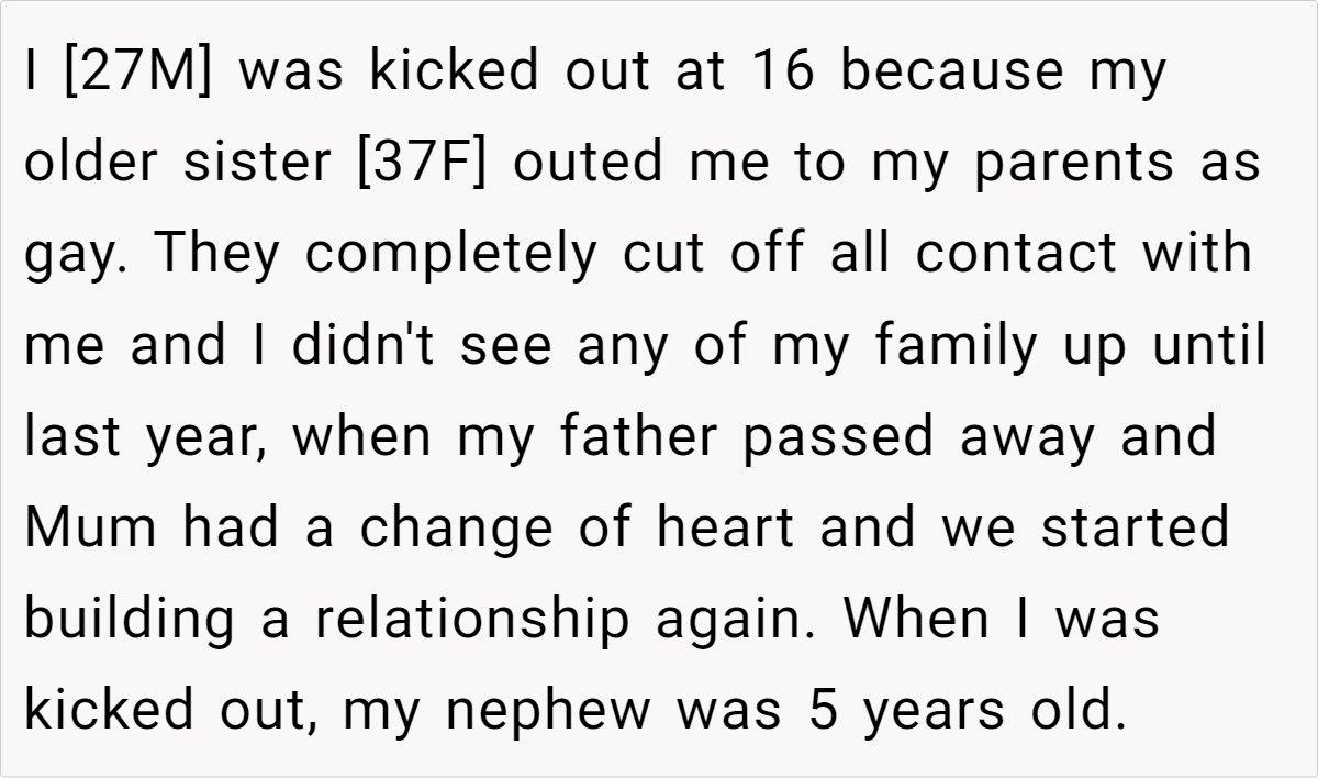 In a recent discussion on Reddit’s “Am I the A**hole?” (AITA) forum, a user shared his experience of being estranged from his family after being outed as gay by his sister. After a decade-long separation, he reconnected with his family, only to face challenges when his nephew inquired about his prolonged absence.