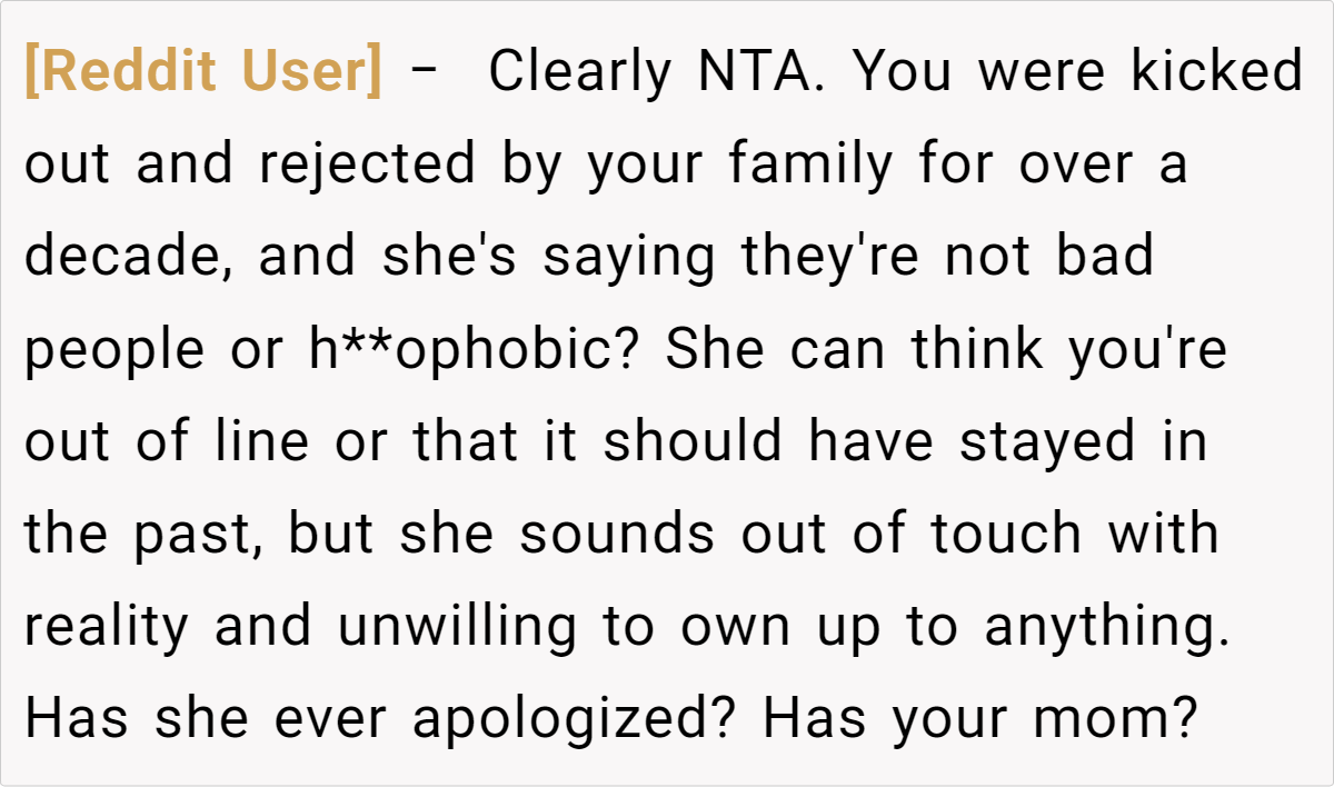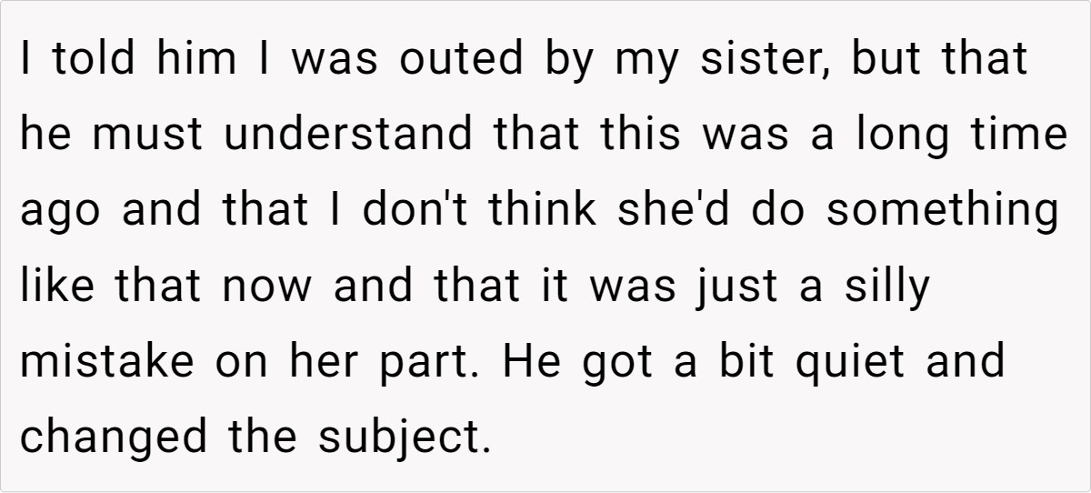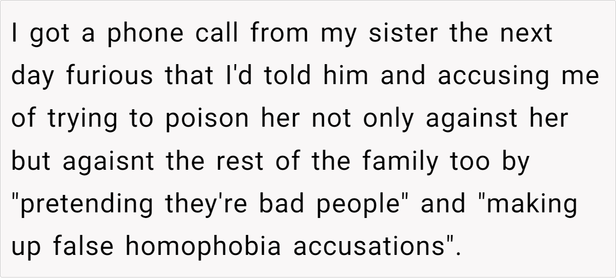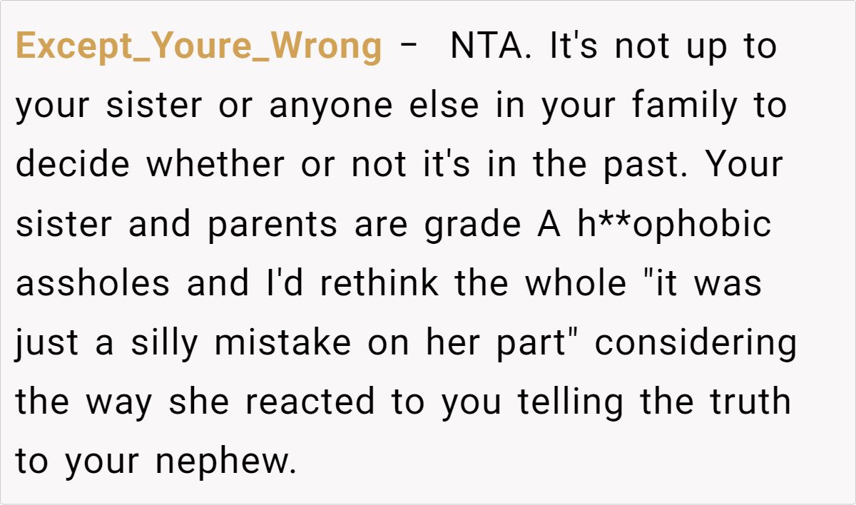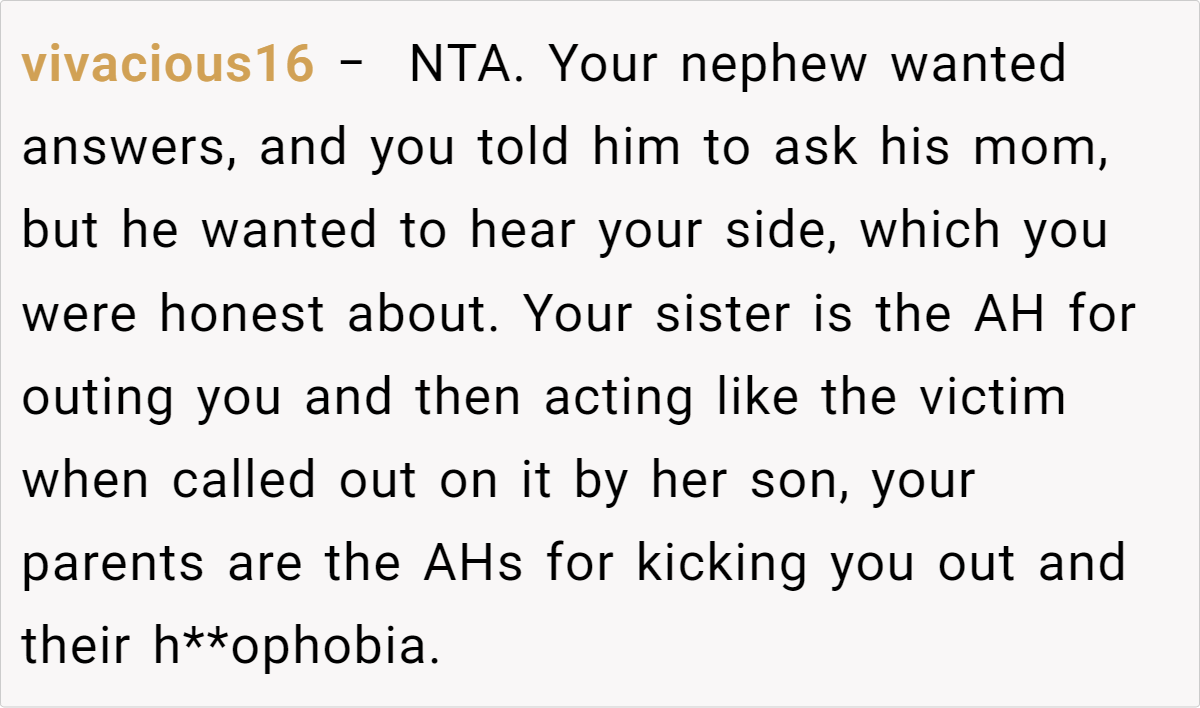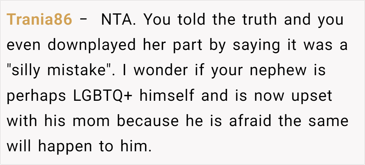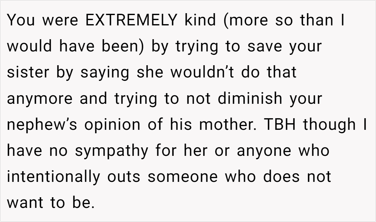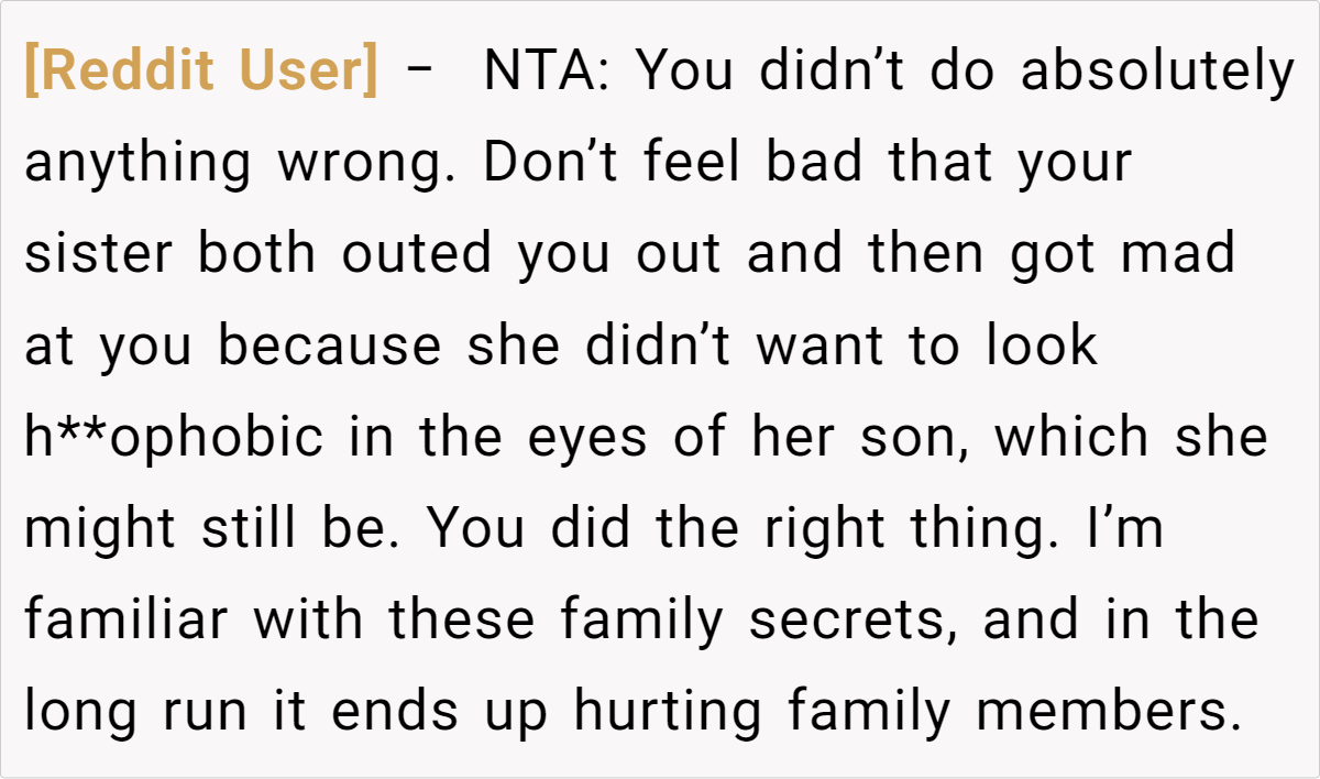 Don’t feel bad that your sister both outed you and then got mad at you because she didn’t want to look homophobic in the eyes of her son.” These perspectives highlight a common sentiment that honesty was the appropriate course of action and that the sister’s unwillingness to acknowledge her past mistakes is problematic.