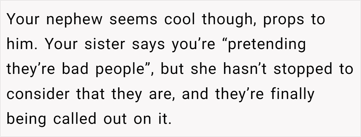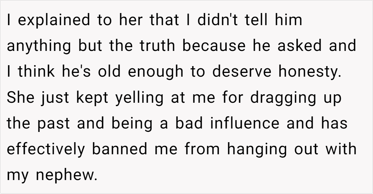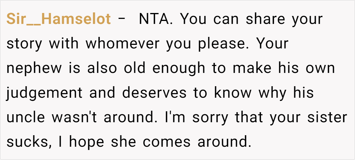 The Reddit community largely supports the uncle’s decision to be honest with his nephew. Many commend his transparency and criticize the sister’s past actions and current response. One user notes, “You told the truth and you even downplayed her part by saying it was a ‘silly mistake’.” Another user adds, “You didn’t do absolutely anything wrong.