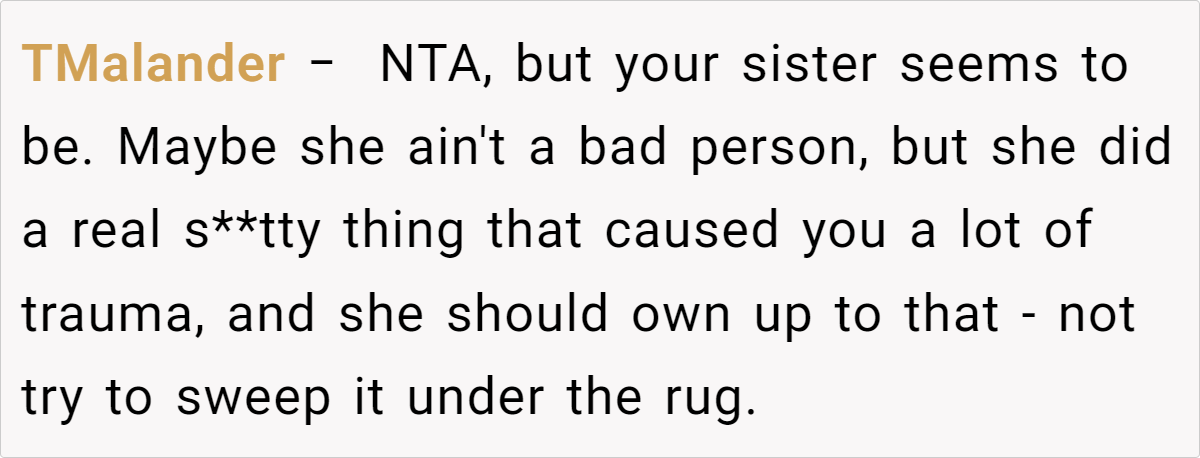 However, the sister’s reaction indicates unresolved issues and a reluctance to confront past actions. Addressing past mistakes is crucial for personal growth and relationship repair. An article from Parents magazine highlights the importance of apologizing within families, stating that acknowledging mistakes and accepting responsibility are key components of effective apologies.