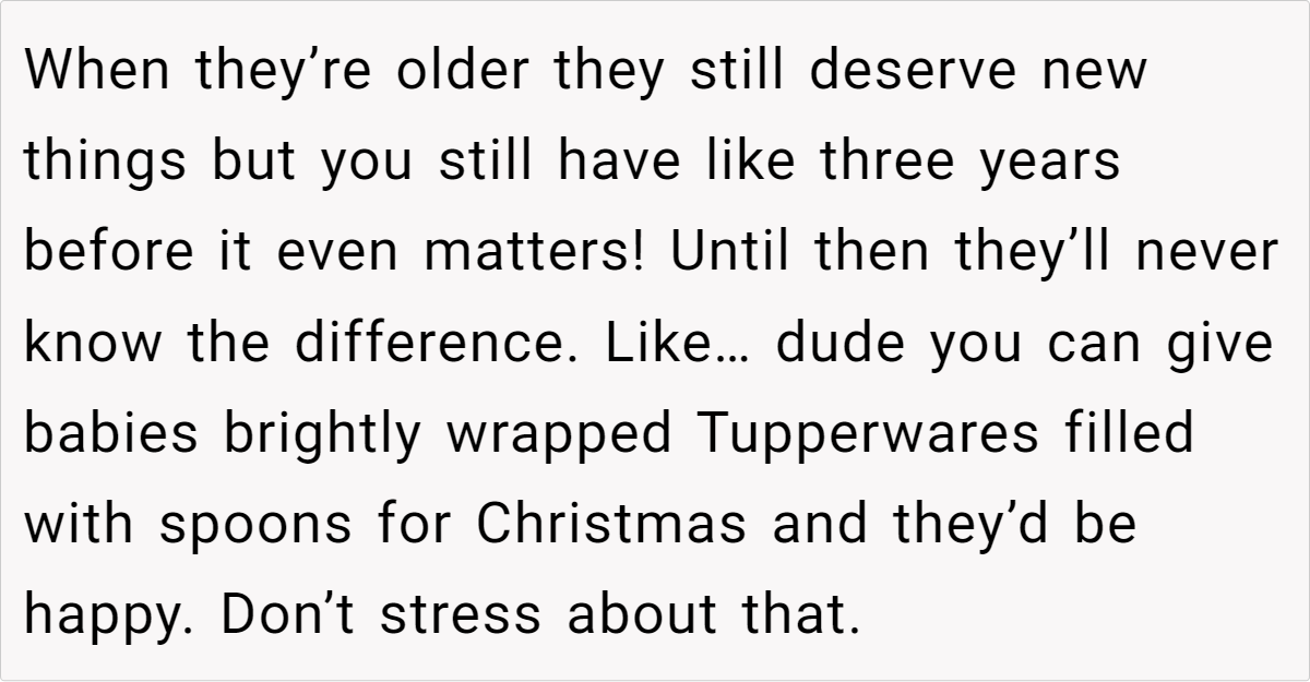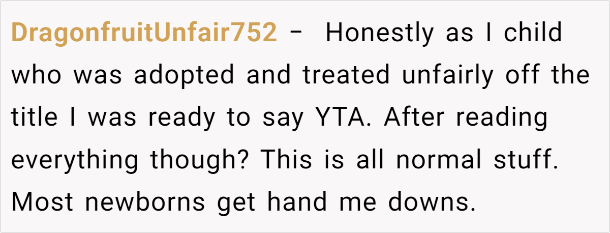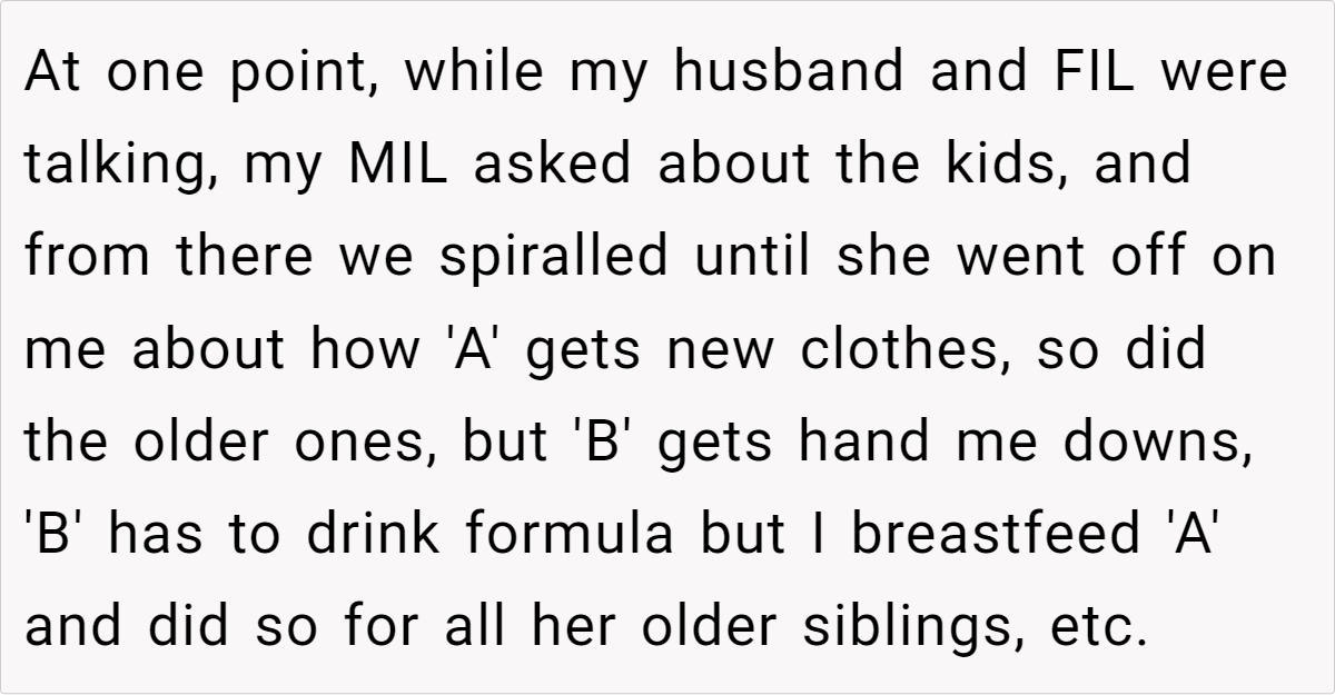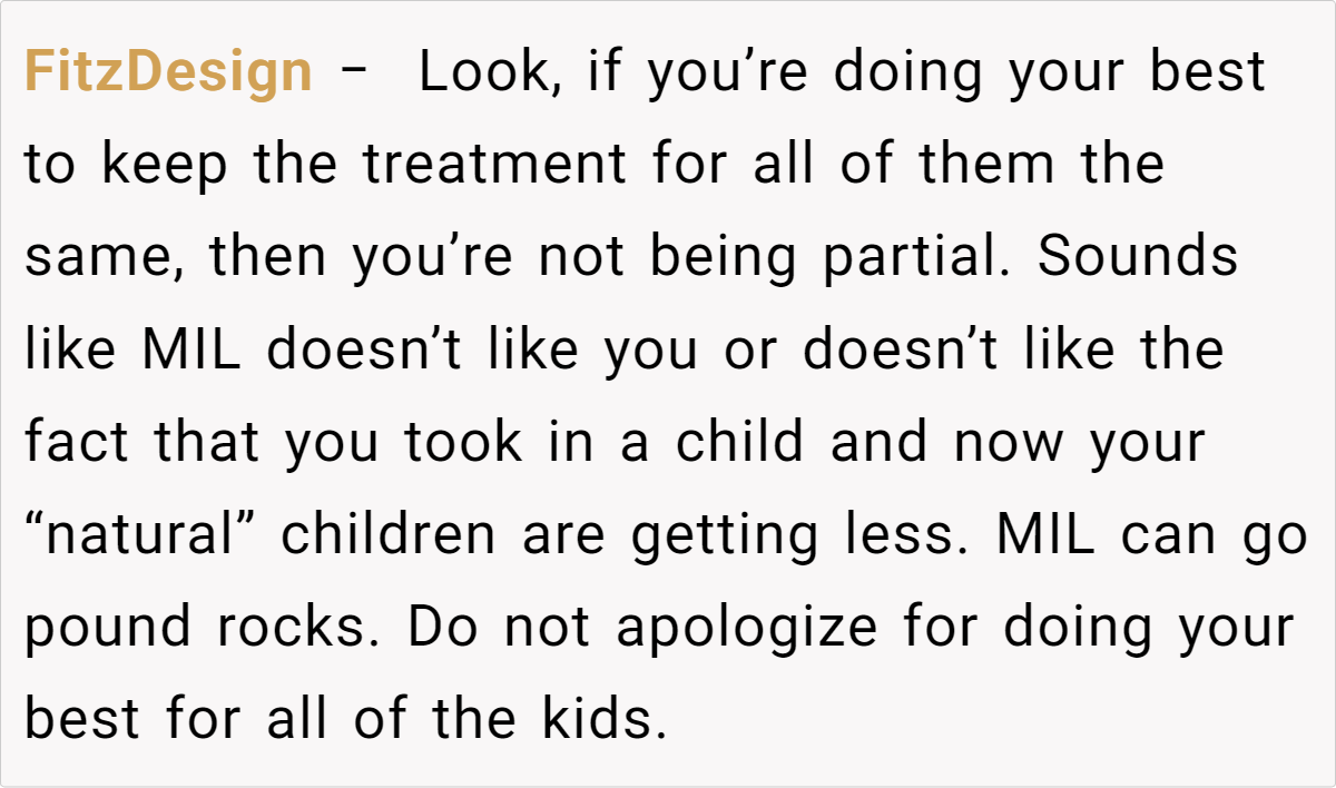 This story underscores the impossible standards parents face when balancing limited resources and societal expectations. While OP’s MIL frames the situation as favoritism, the reality is a family doing their best under strain. Verdict: NTA. Fairness isn’t about equal things—it’s about equal care, and OP’s choices reflect that.