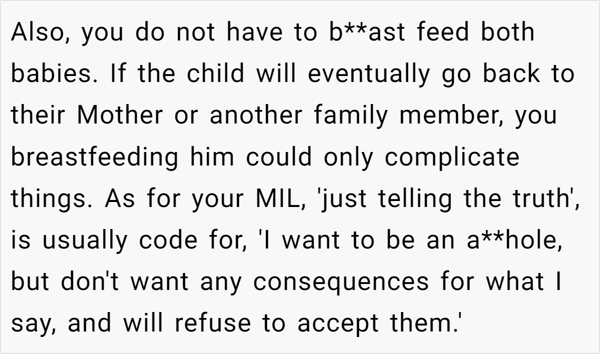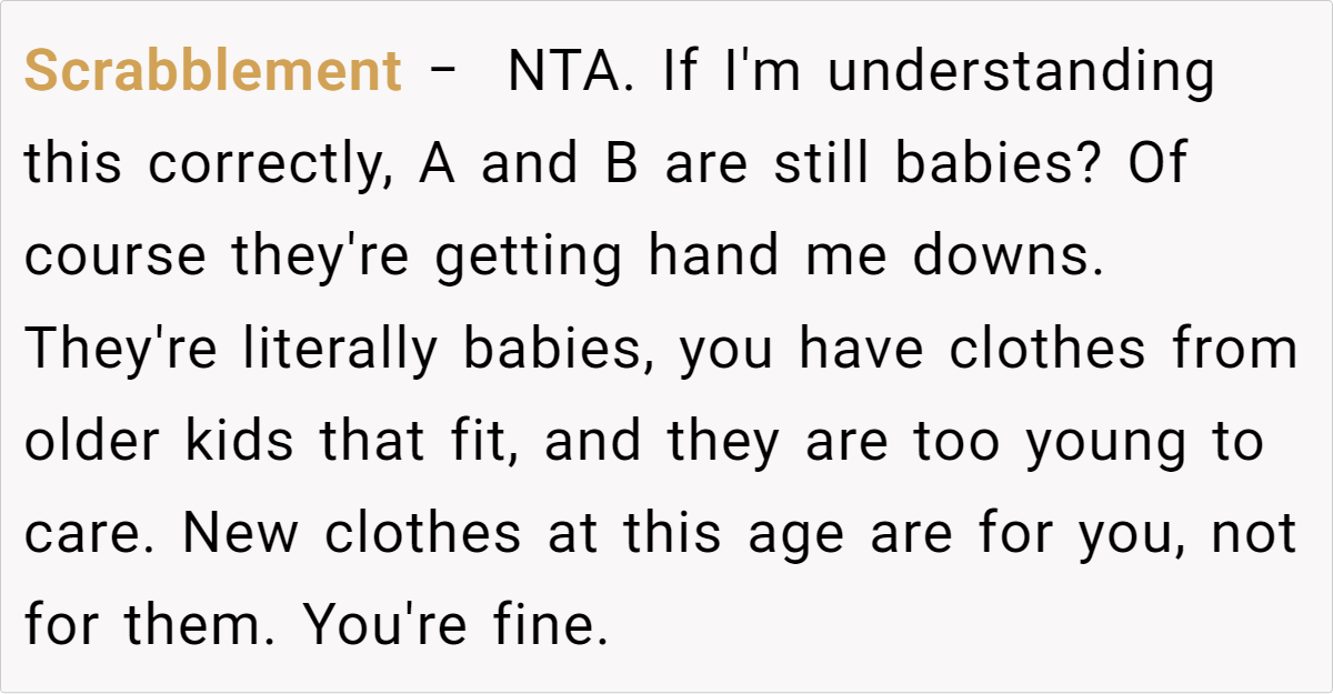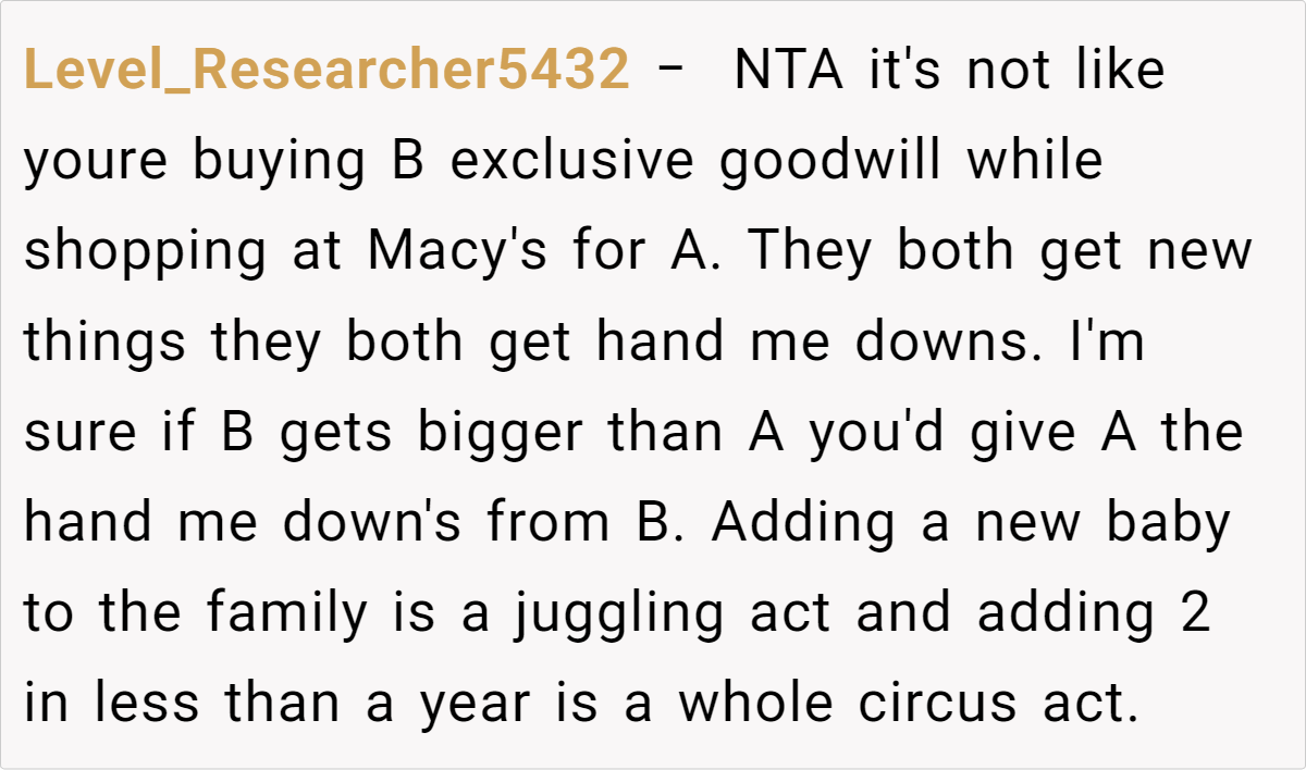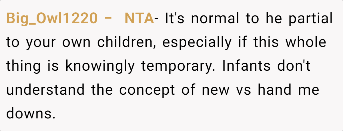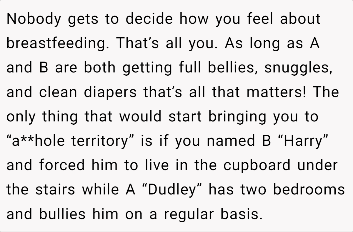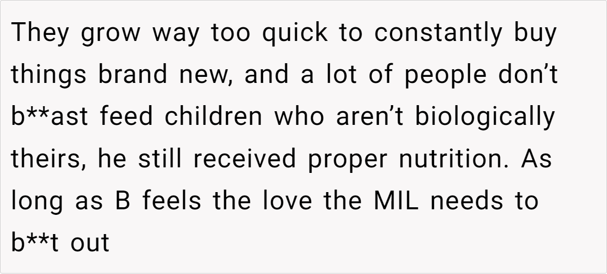A 2022 study in Family Relations Journal highlights that “parents in low-income households often make ‘tiered’ sacrifices, prioritizing immediate needs (e.g., feeding infants) over perceived luxuries (e.g., new clothes).” OP’s choice to breastfeed her biological child while using formula for “B” aligns with resource optimization, not favoritism.