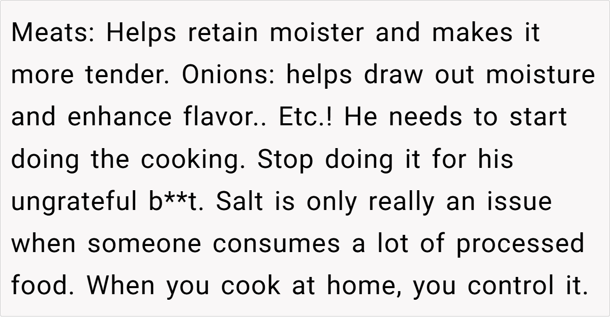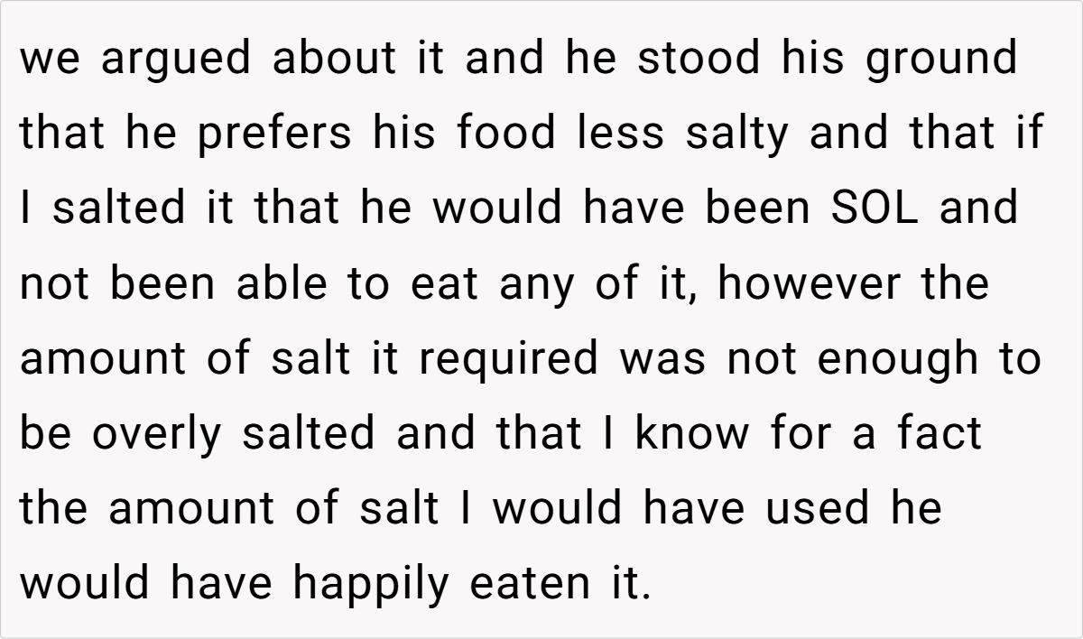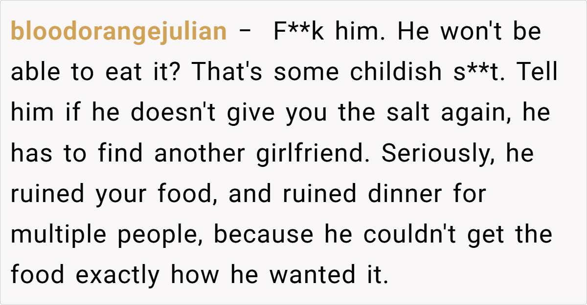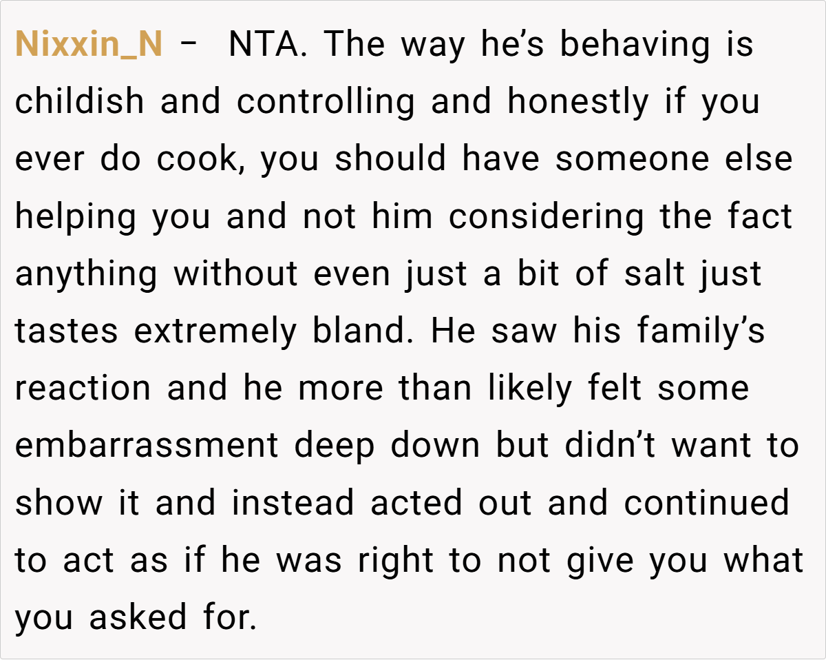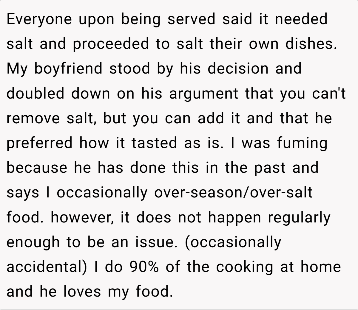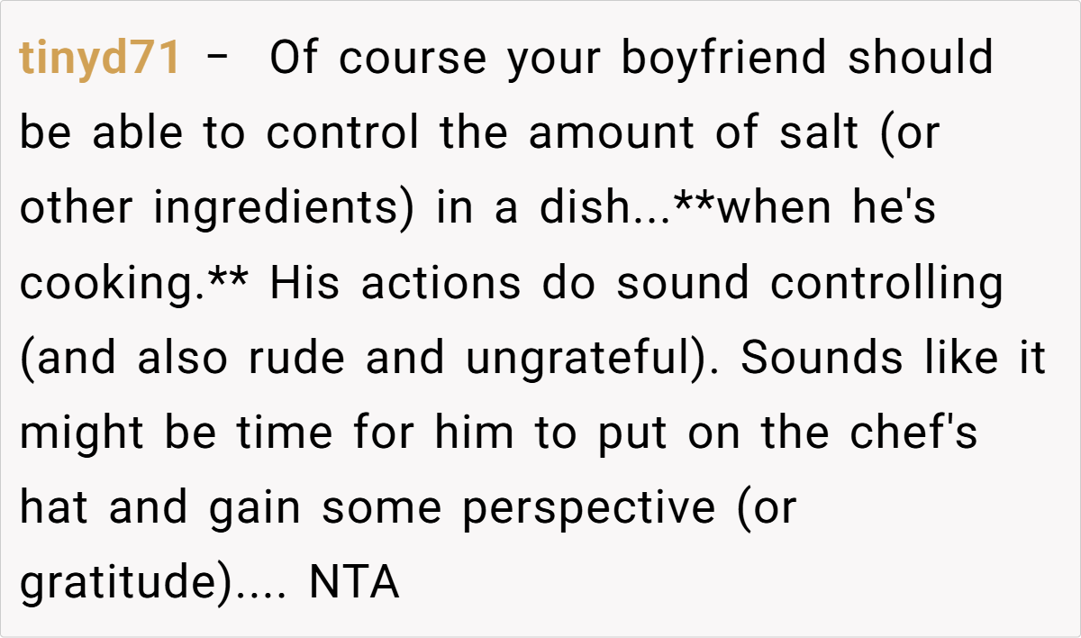 In a general overview, the Reddit community firmly sided with me. Most commenters felt that my boyfriend’s refusal to follow my seasoning request—and his subsequent insistence on his own taste—was not only misguided but also controlling. Many highlighted that cooking is a collaborative art, and if someone volunteers their time and skill, their vision should be respected.