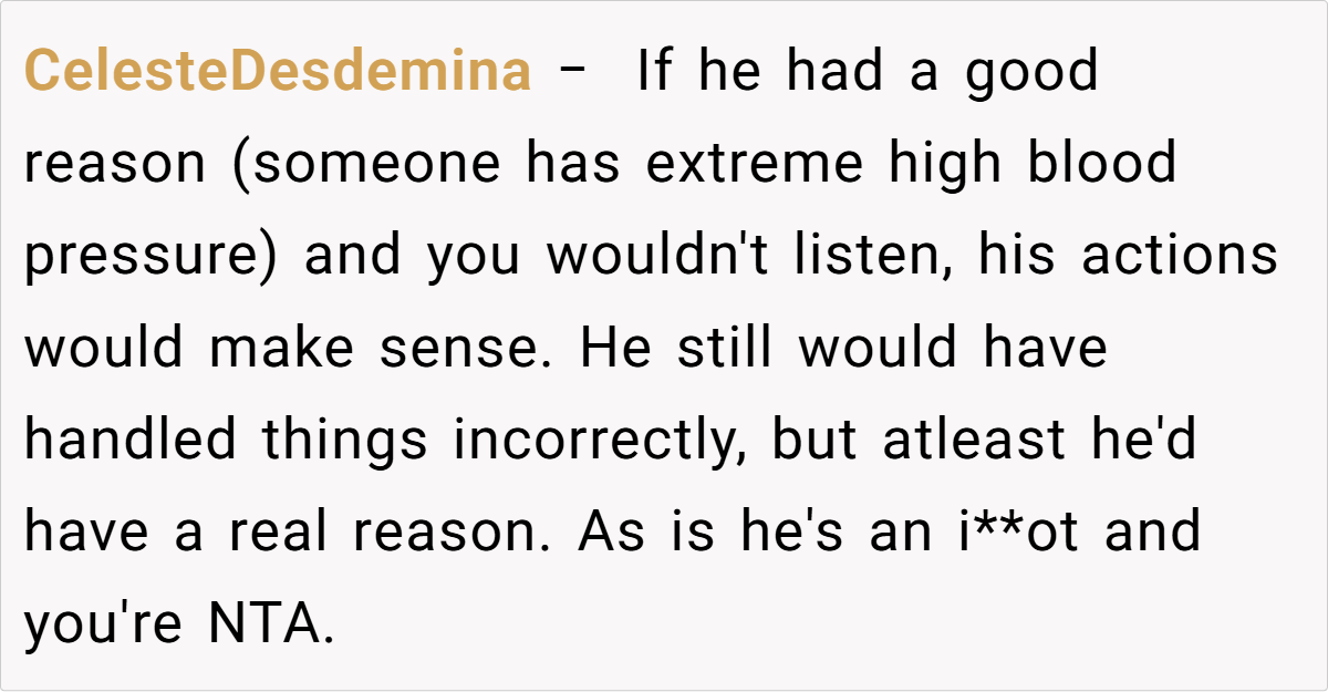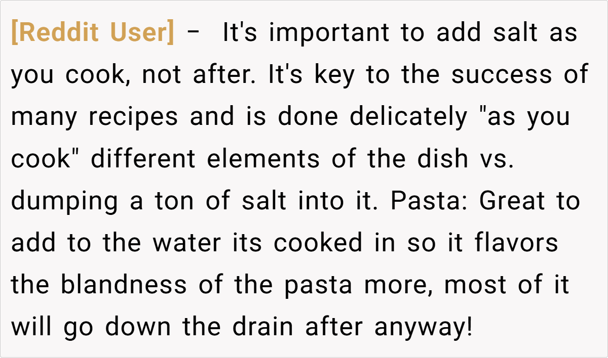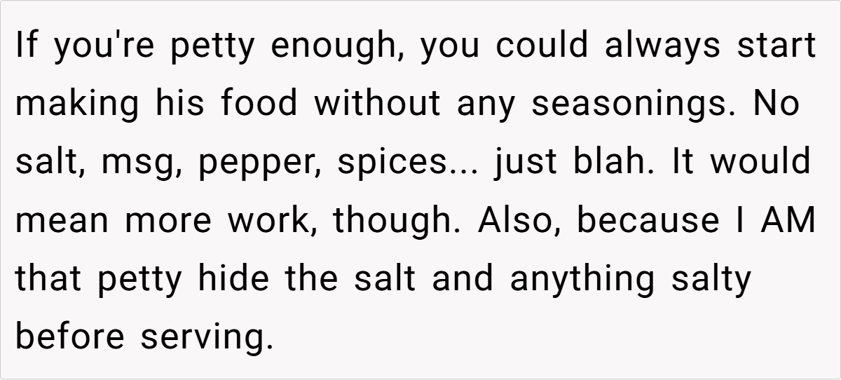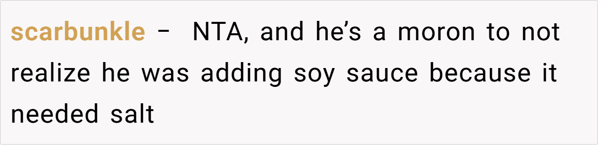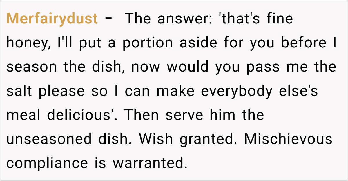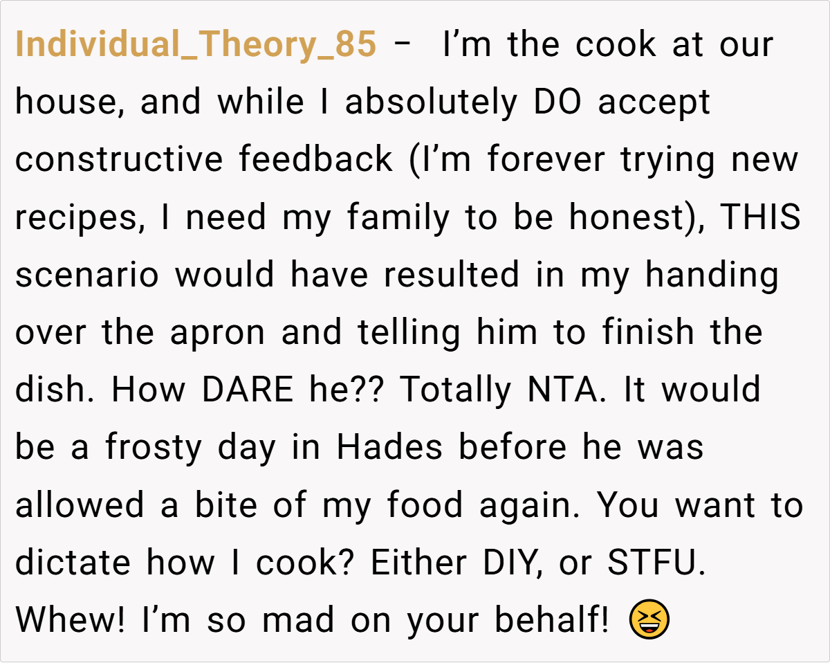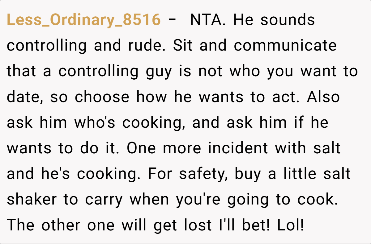 In a general overview, the Reddit community firmly sided with me. Most commenters felt that my boyfriend’s refusal to follow my seasoning request—and his subsequent insistence on his own taste—was not only misguided but also controlling. Many highlighted that cooking is a collaborative art, and if someone volunteers their time and skill, their vision should be respected.