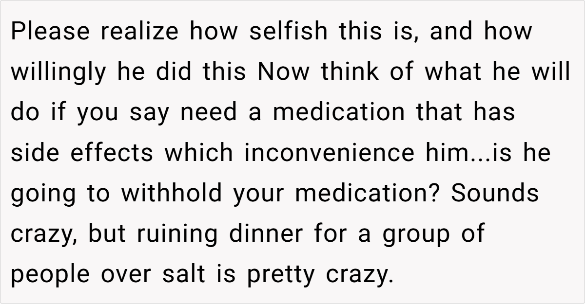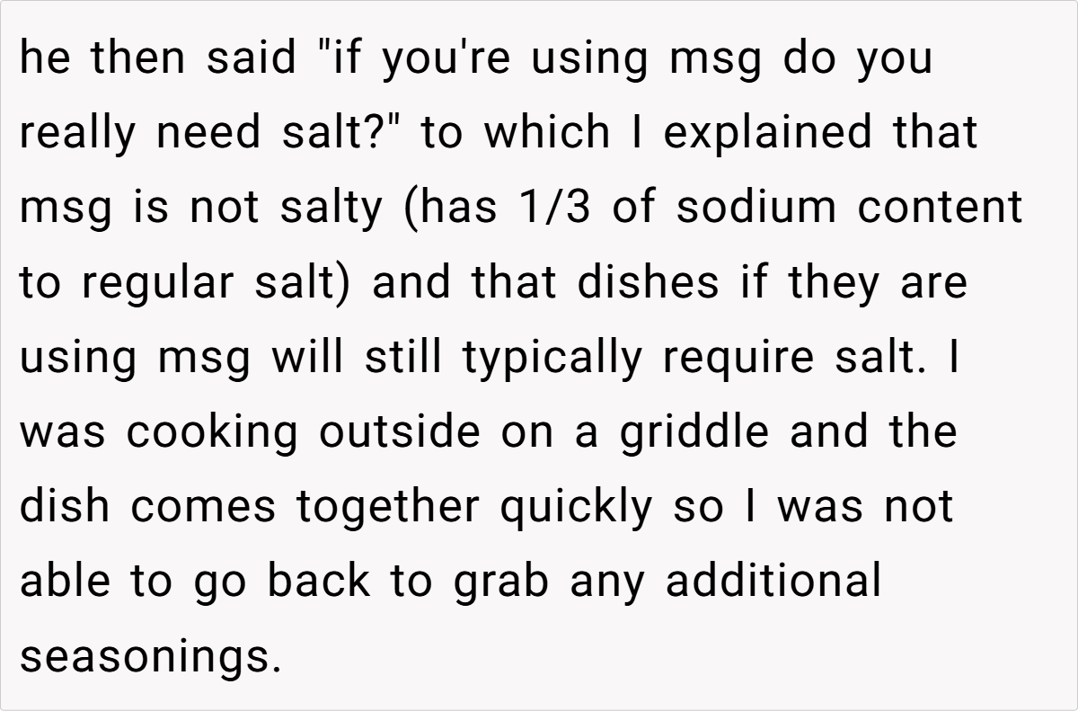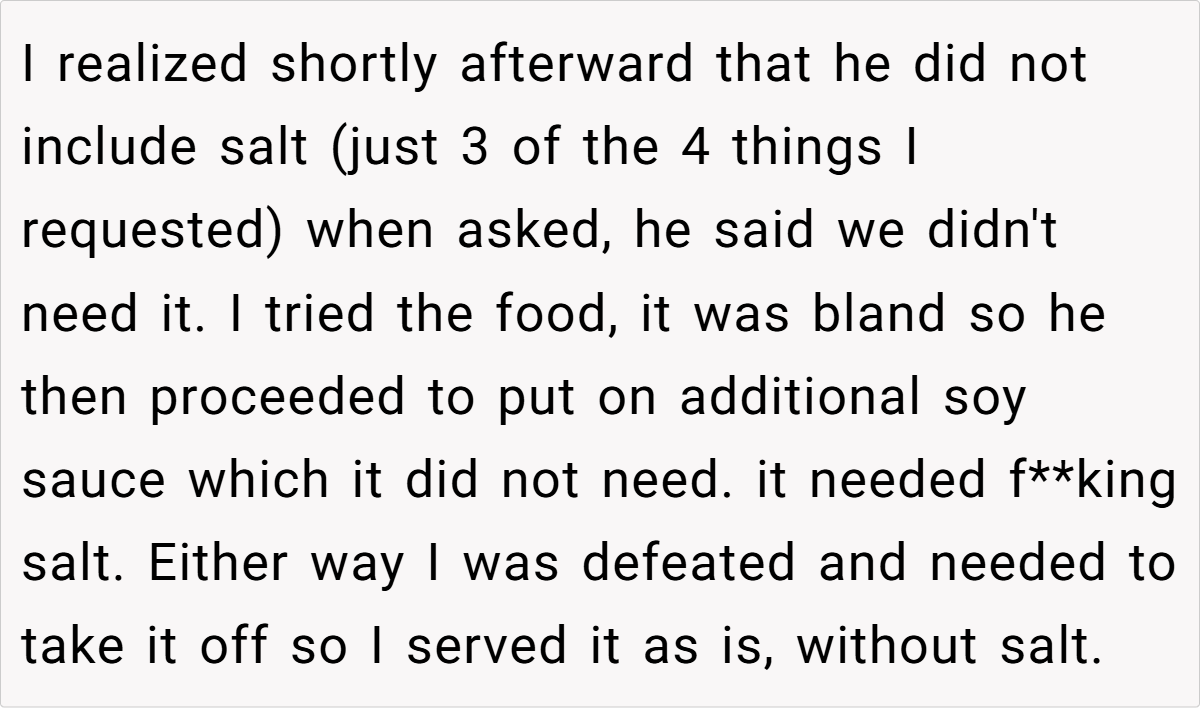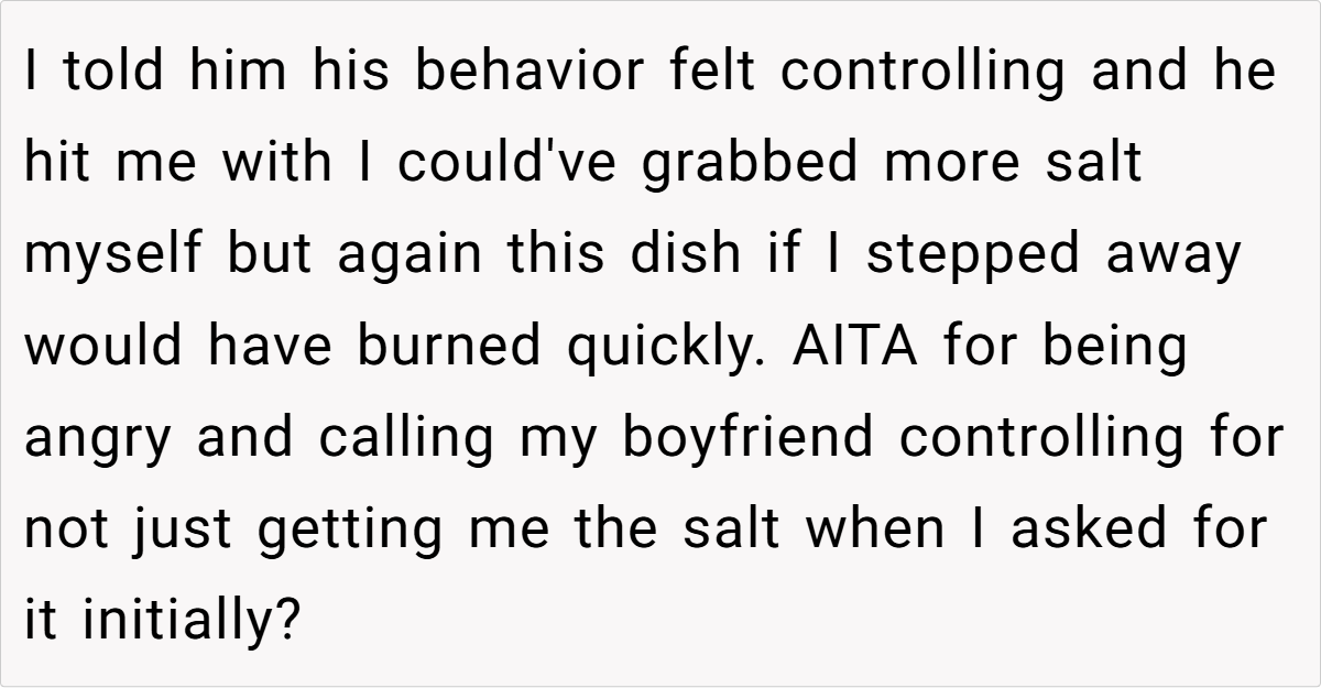 Adding insult to injury, as the dish went out bland and unbalanced, my boyfriend doubled down on his claim that more salt wasn’t needed. His decision not to follow my request—and his subsequent refusal to acknowledge the dish’s flaw—made me wonder: when does personal taste cross the line into controlling behavior?