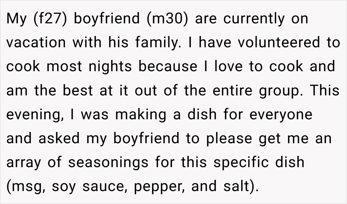 Vacation should be a time for relaxation and enjoyment, but sometimes even a simple dinner can spiral into unexpected drama. While on holiday with his family, I volunteered to cook most evenings—a passion of mine and something my boyfriend (m30) usually praises. This particular night, while I was busy working on a delicious dish over a sizzling griddle, I asked him to fetch a specific array of seasonings: msg, soy sauce, pepper, and salt.