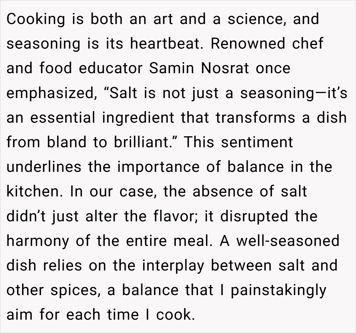 This culinary conflict goes beyond a missing pinch of salt—it’s about the balance between creative autonomy and accommodating personal preferences in a relationship. While differing tastes are inevitable, respecting the chef’s intent is crucial to keeping the kitchen a place of joy rather than contention. Have you ever experienced a similar clash over something seemingly trivial? How do you navigate creative differences in collaborative situations? Share your thoughts and stories in the comments below.