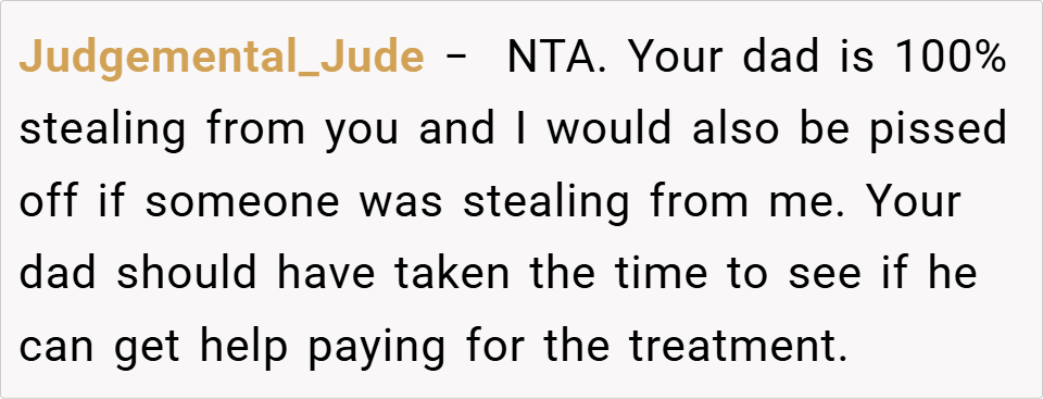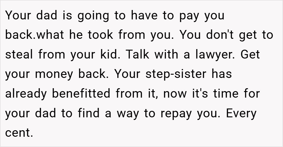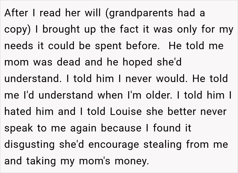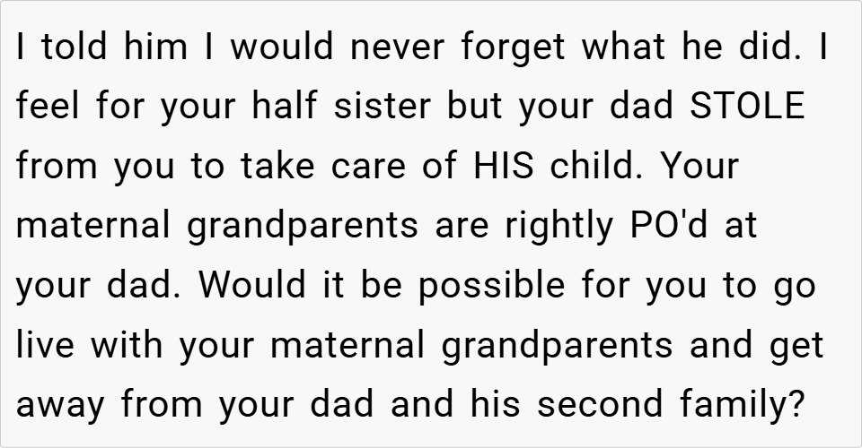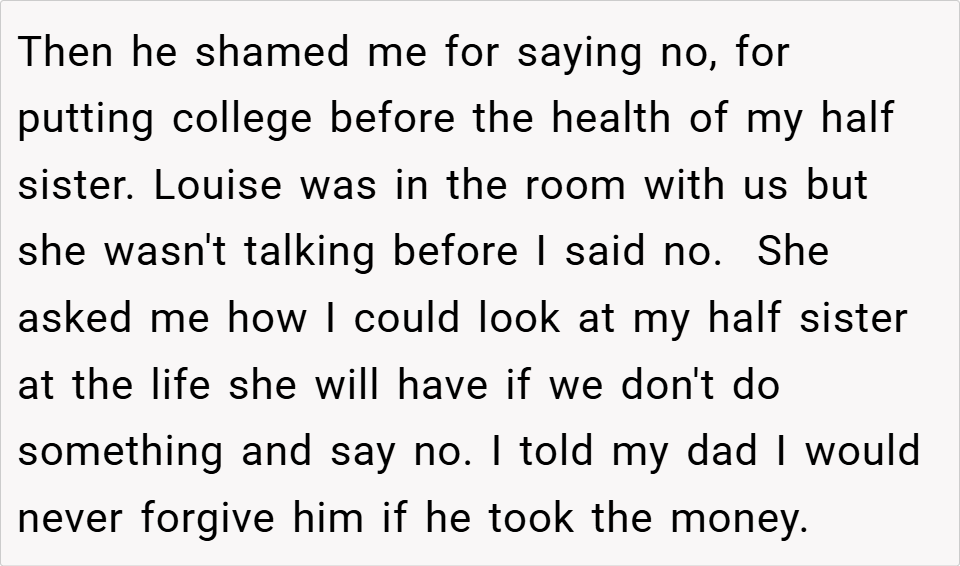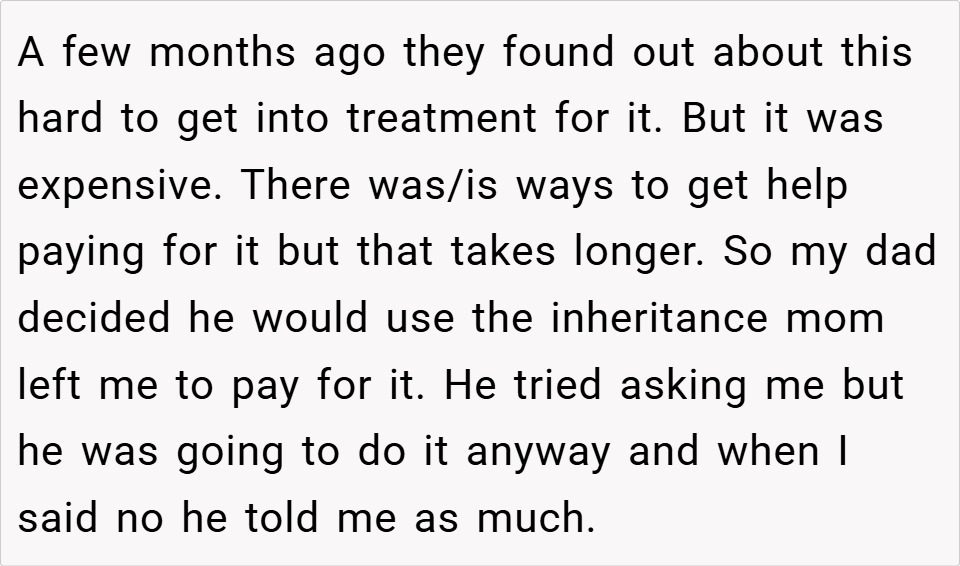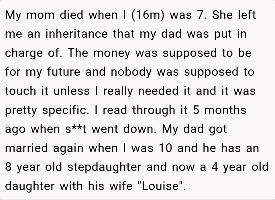 A 16-year-old boy discovered his father planned to take the inheritance left by his late mother to fund an expensive treatment for his half-sister, despite it being specifically allocated for the boy’s future. When the boy refused, his father insisted on using the money anyway, calling him selfish for prioritizing college.
