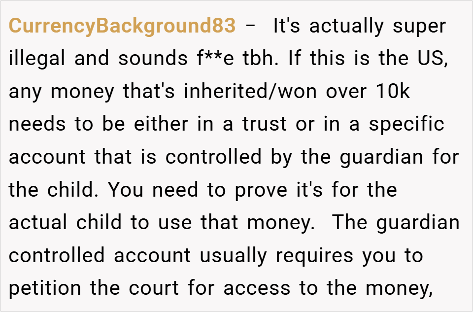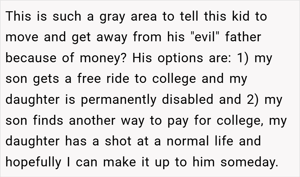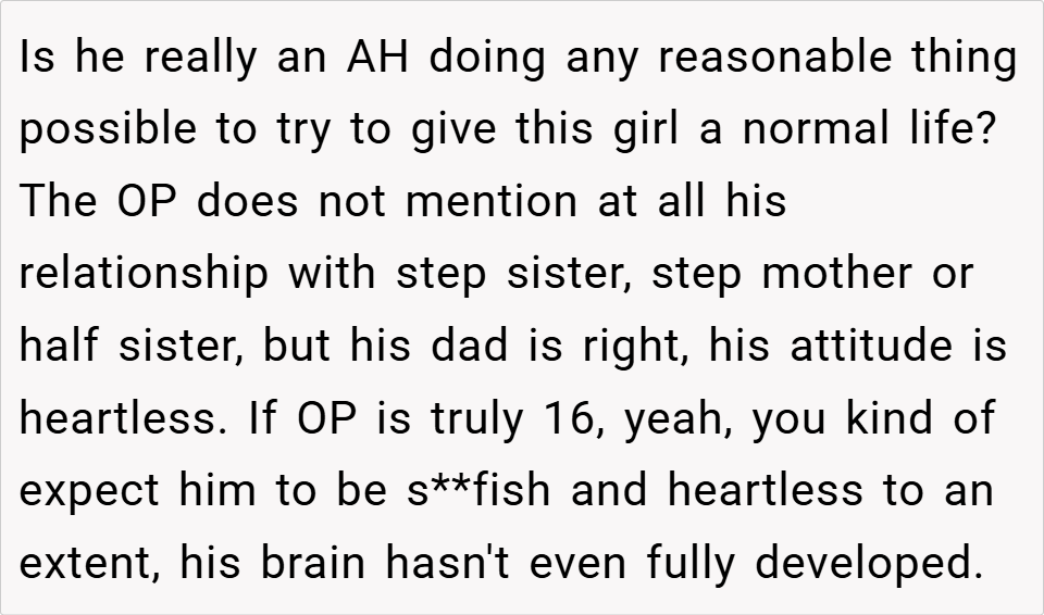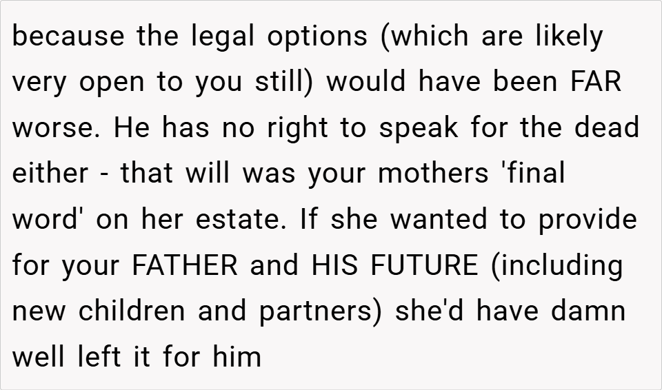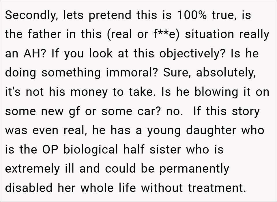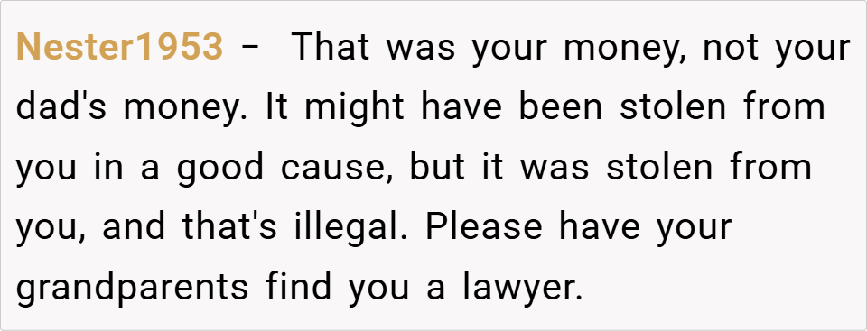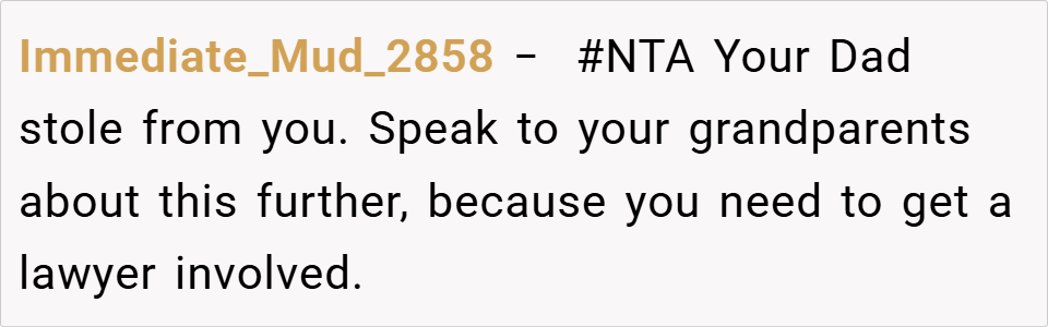 A 16-year-old boy discovered his father planned to take the inheritance left by his late mother to fund an expensive treatment for his half-sister, despite it being specifically allocated for the boy’s future. When the boy refused, his father insisted on using the money anyway, calling him selfish for prioritizing college.