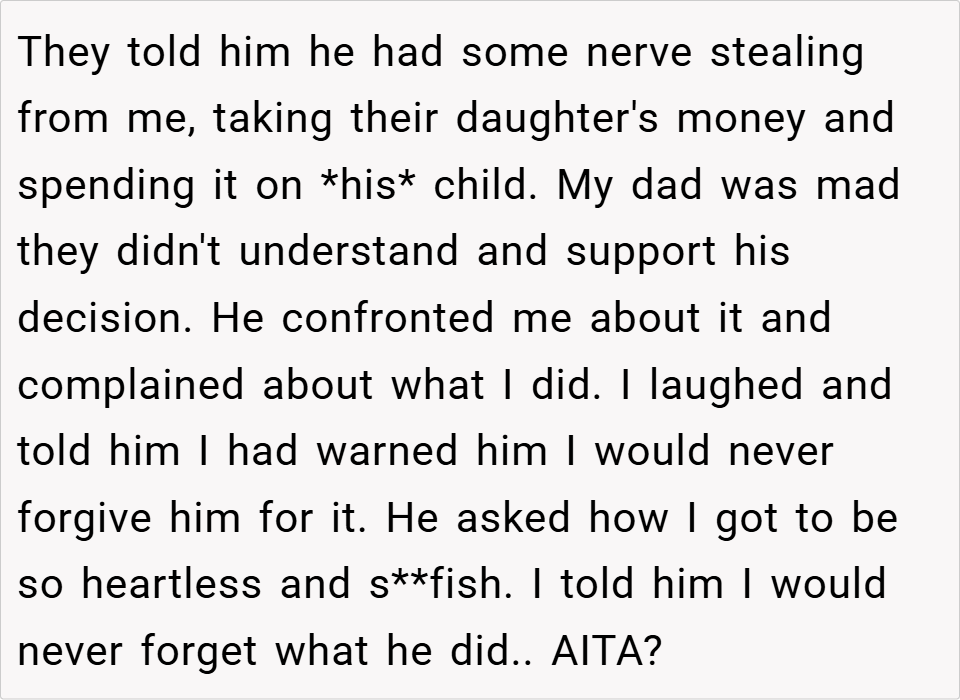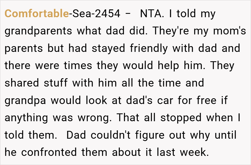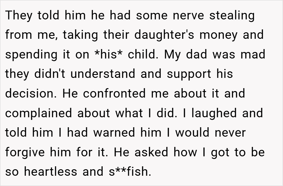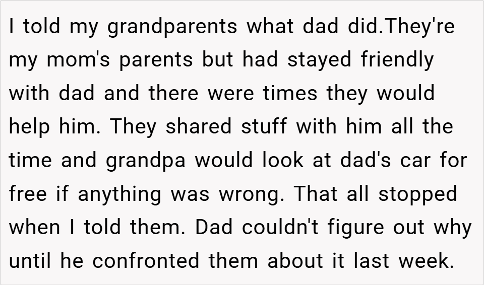 The boy told his grandparents—his late mom’s parents—about the situation, leading them to cut off all support to the father. Now angry, the father confronted the boy, only to be met with laughter and the reminder that the boy warned him he would never forgive the betrayal. Read the original story below…