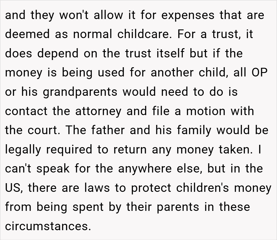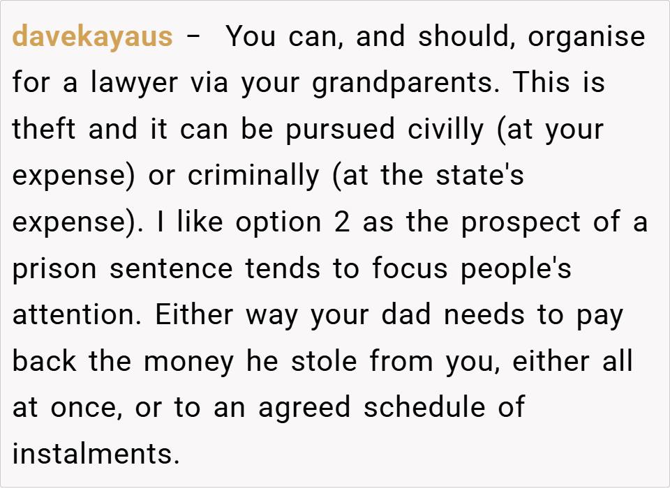 Whether or not tis is F**e the inheritance was just taken. To me this shows that Dad has probably been funneling money from the “family” to the youngest daughter – to include borrowing from Grandparents. Nothing was said about repayment or replacing it . So Dad is taking advantage of his son and never planning on replacing what he stole. Sch a bad example. Take Dad to court- it is his son’s money and he has no intention of EVER replacing it.