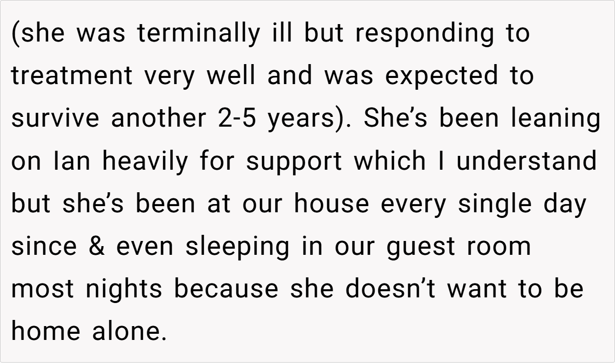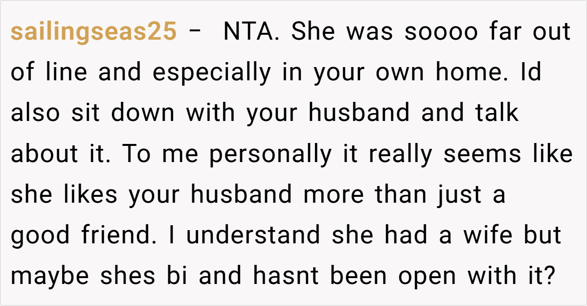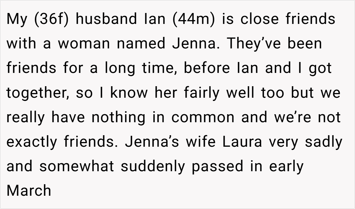 In this emotionally charged account, a 36-year-old woman details a confrontation with her husband’s long-time friend, Jenna, following the sudden death of Jenna’s wife, Laura. While the narrator empathizes with Jenna’s need for support during her time of loss, the continuous presence and increasingly territorial behavior of Jenna in the couple’s home have pushed her to the brink.
