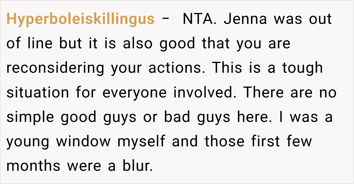 The community reaction to this incident has been divided. Many sympathize with the narrator, arguing that while Jenna’s grief is understandable, her behavior—especially her invasive presence and snide remarks—crossed acceptable boundaries.