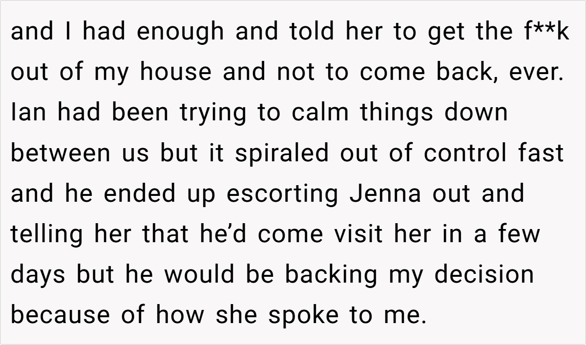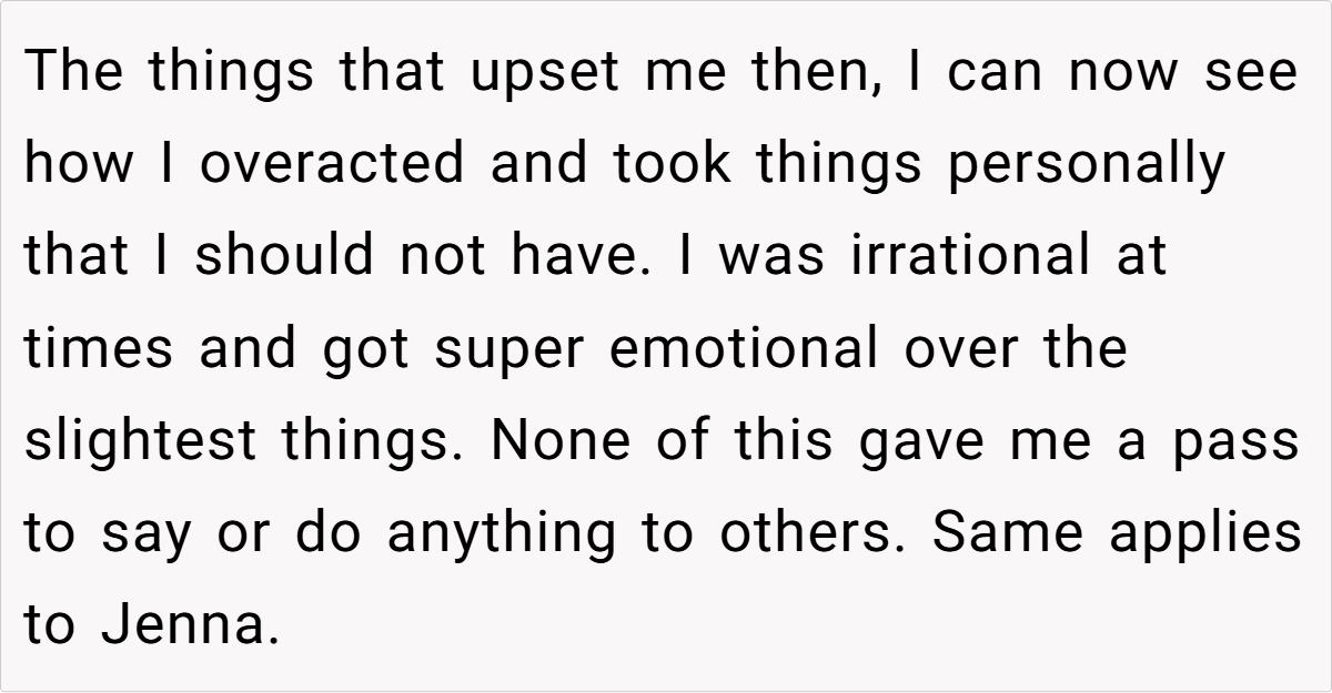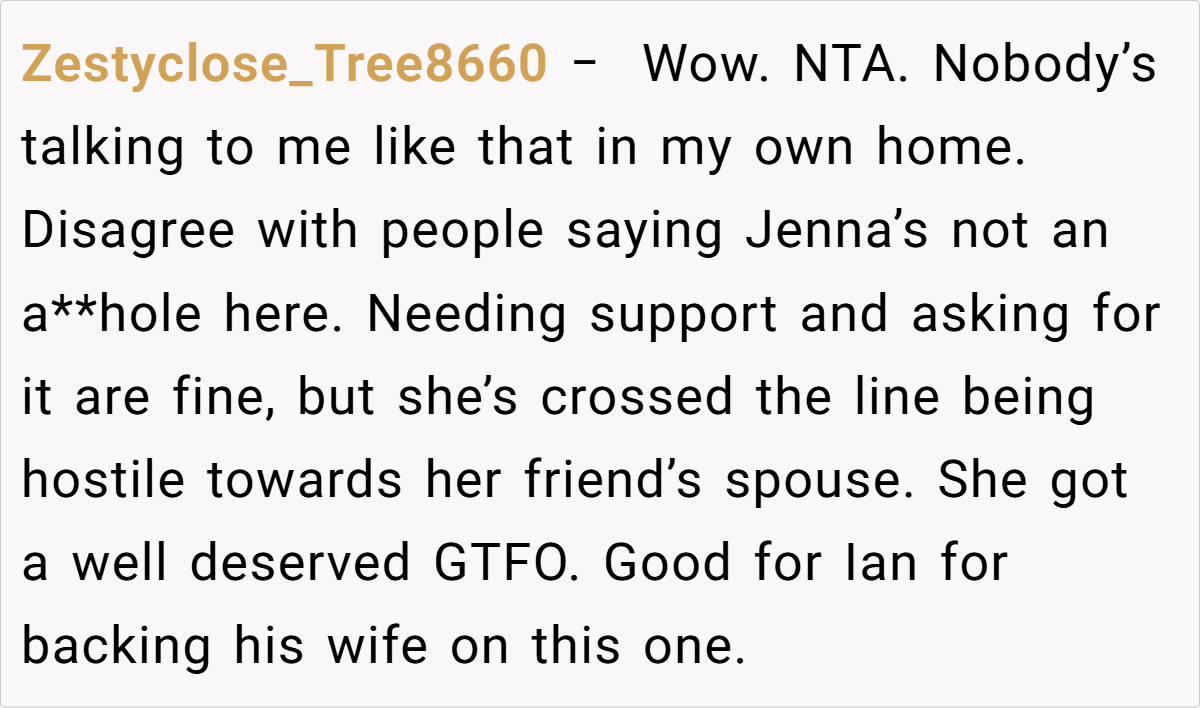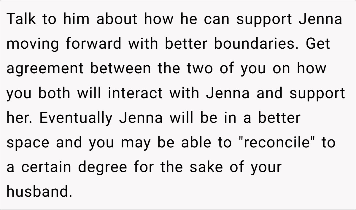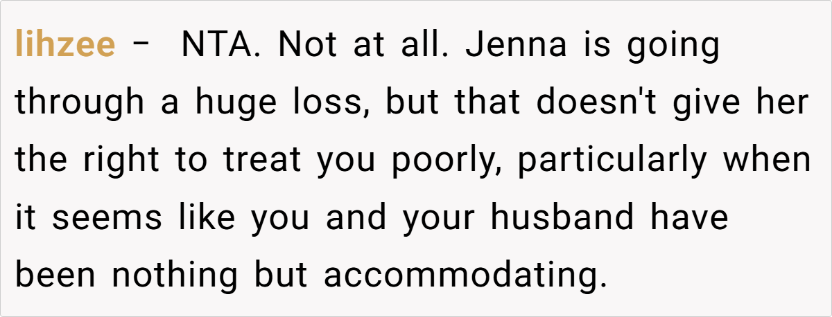 Some commenters suggest that the narrator was justified in asserting her need for space, while others express concern that the situation might have been handled with more empathy given the context of Jenna’s loss. Overall, there is a consensus that while emotions run high during times of grief, maintaining clear boundaries is essential for the health of all relationships involved.
