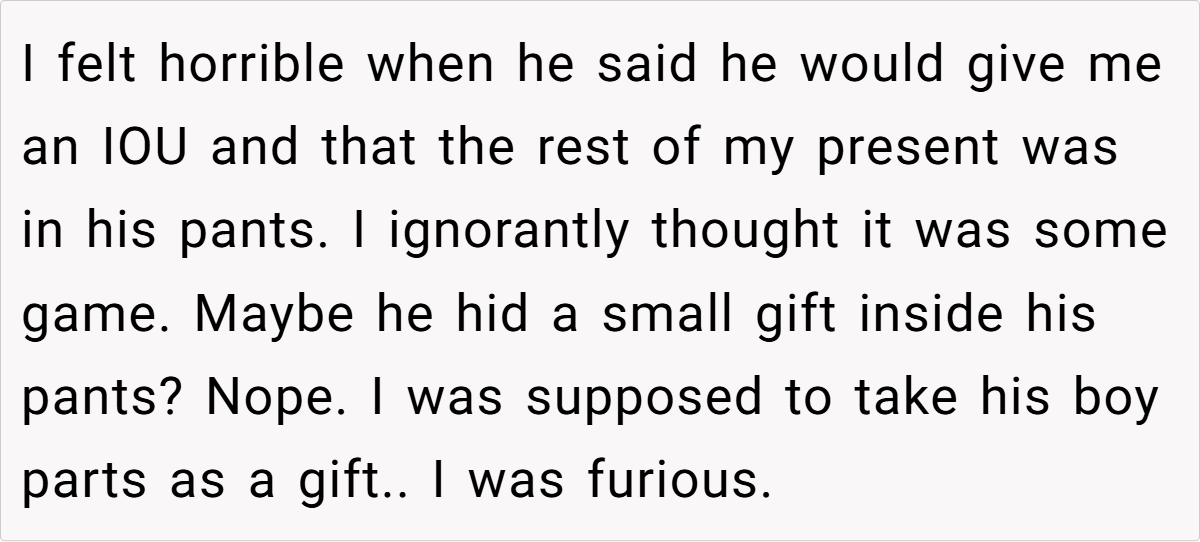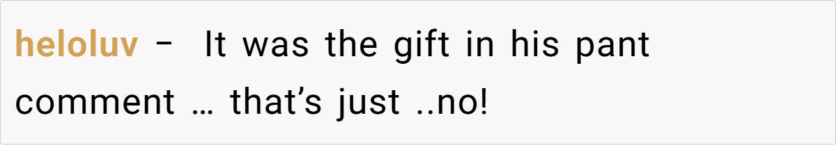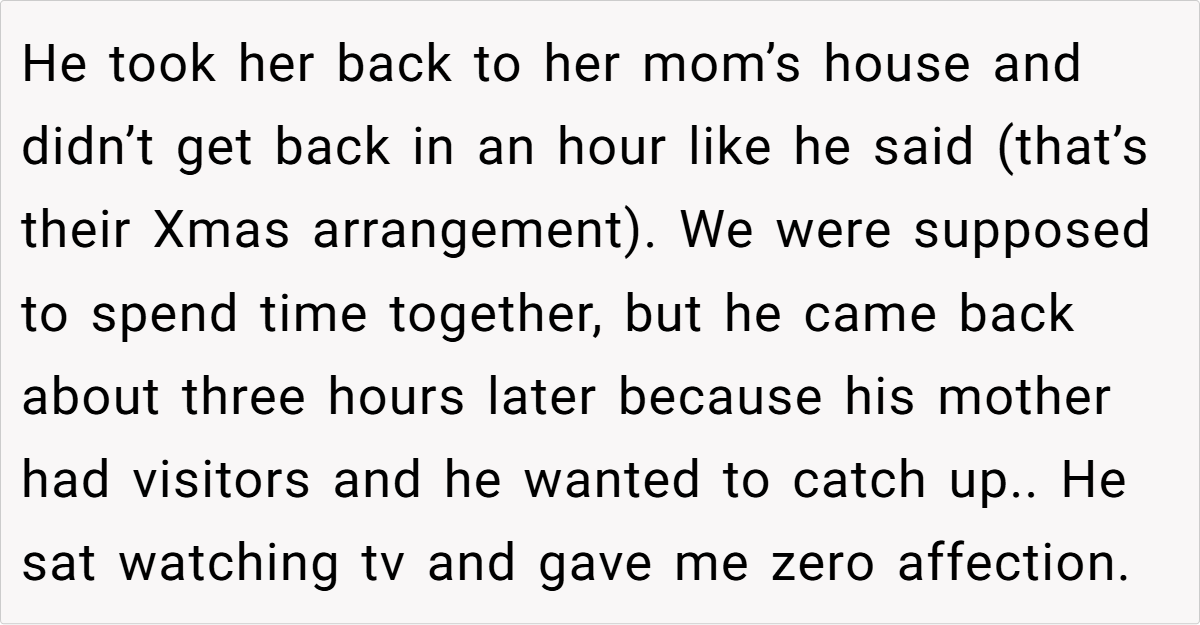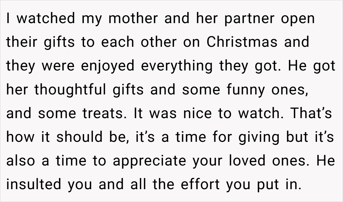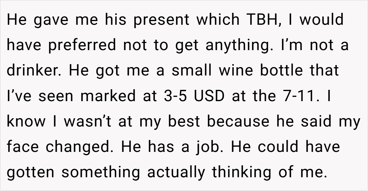 While she put considerable thought, effort, and expense into creating a memorable holiday for both him and his daughter, his response was a cheap, dismissive wine bottle paired with a crude, off‑hand comment about “the rest of [her] present being in his pants.”