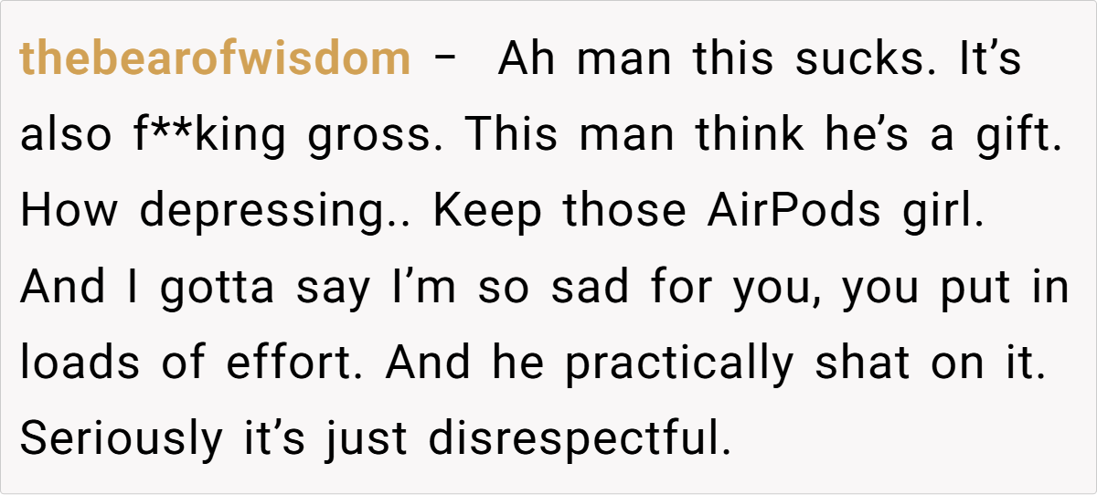In this situation, the boyfriend’s actions and his vulgar joke about his “gift” not only diminished the value of the author’s heartfelt efforts but also signaled a lack of consideration for her feelings—a serious breach in emotional reciprocity.
