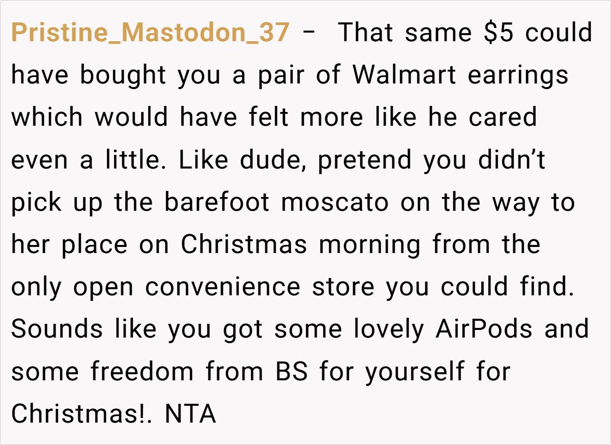 With the added sting of his earlier insensitive remarks about her appearance, her decision to break up with him—and to block him afterward—raises the question: was she the asshole for ending things over a lousy Christmas present, or was her reaction justified?