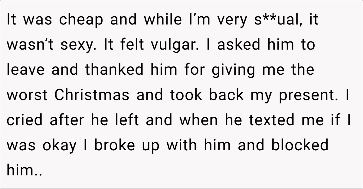 Ultimately, the question is not simply about a crappy Christmas present—it’s about feeling truly valued in a relationship. When a partner’s thoughtless gift and subsequent vulgarity overshadow the effort you put into celebrating together, it can be seen as a sign of deeper issues in mutual respect and care. In this case, the author’s reaction reflects her rightful demand for dignity and consideration.