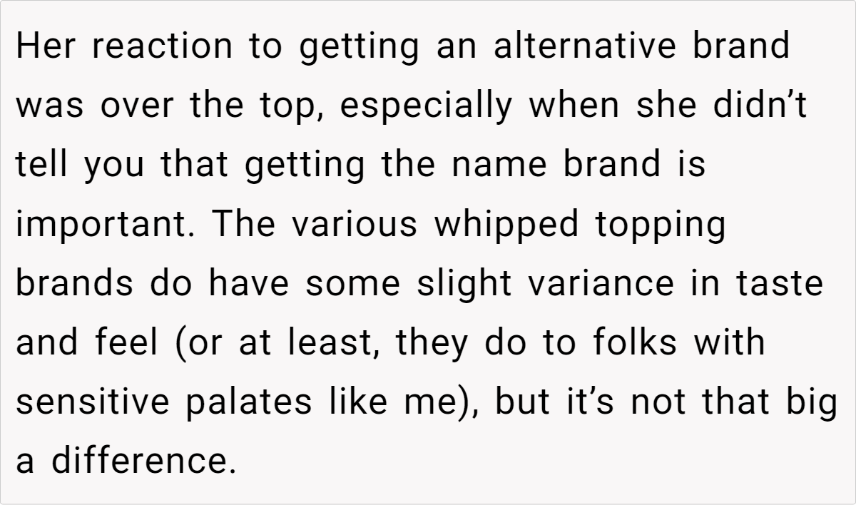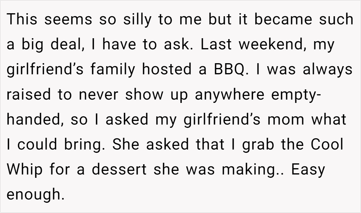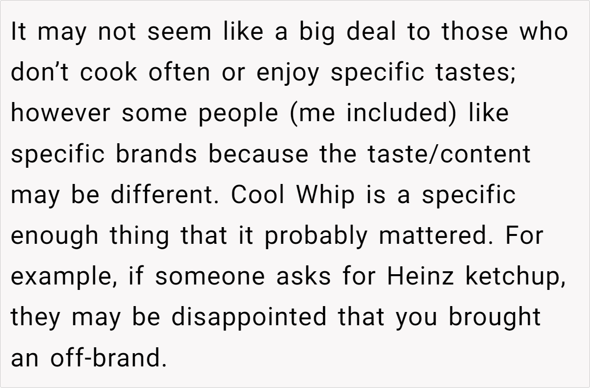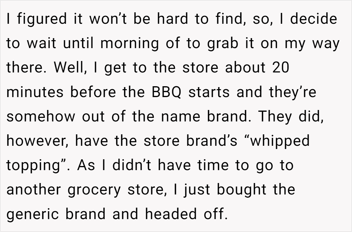 At family gatherings, even the smallest mix-up can spark a surprisingly heated debate. This story centers on a seemingly trivial grocery run that escalated into a full-blown showdown over brand loyalty. When asked to bring Cool Whip for a dessert at a BBQ, our redditor found himself in a bind—only to discover that the store was out of the name brand, leaving him with the generic alternative. The simple task of picking up a dessert topping turned into a lesson in expectations and communication, highlighting just how passionately some people guard their brand preferences.