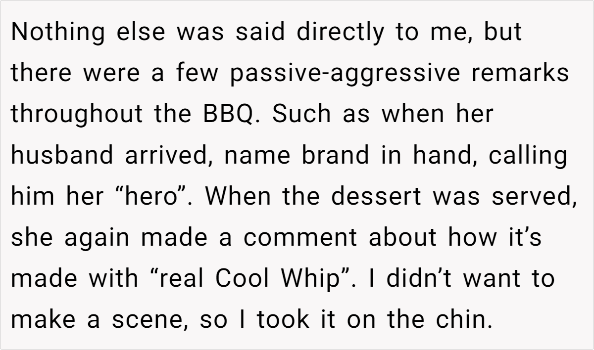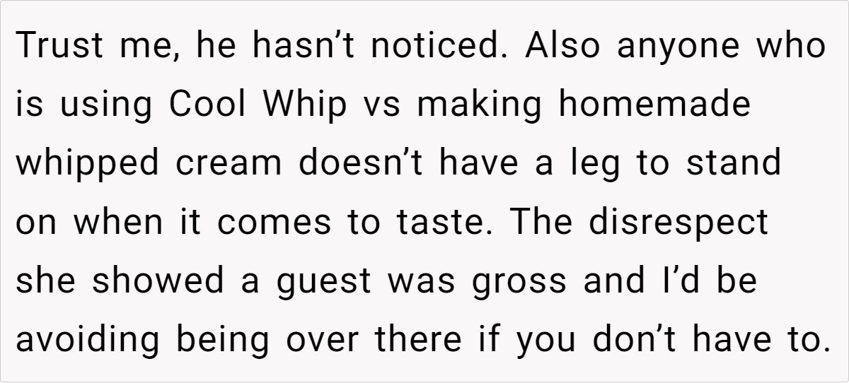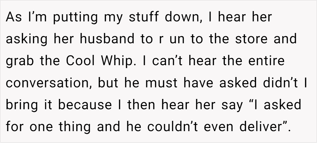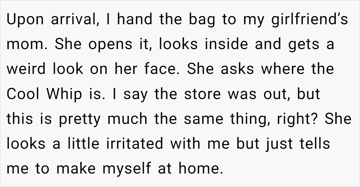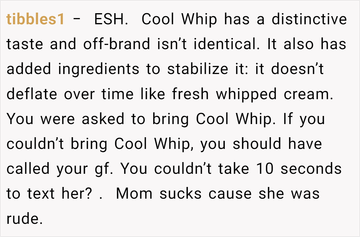 At family gatherings, even the smallest mix-up can spark a surprisingly heated debate. This story centers on a seemingly trivial grocery run that escalated into a full-blown showdown over brand loyalty. When asked to bring Cool Whip for a dessert at a BBQ, our redditor found himself in a bind—only to discover that the store was out of the name brand, leaving him with the generic alternative. The simple task of picking up a dessert topping turned into a lesson in expectations and communication, highlighting just how passionately some people guard their brand preferences.