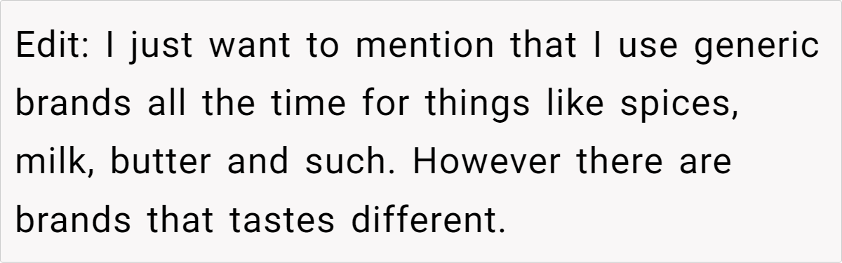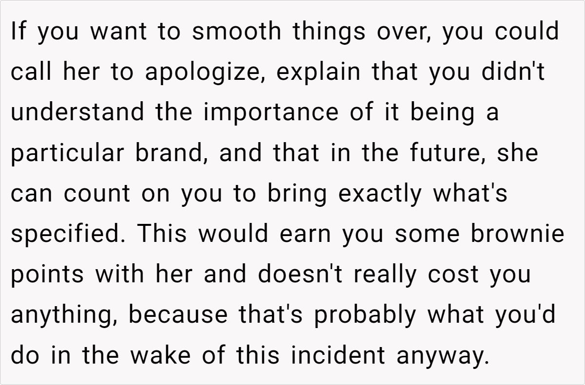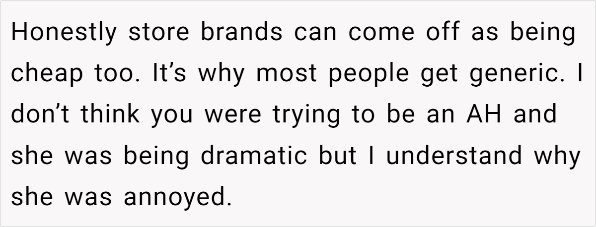 Finally, this scenario offers a practical takeaway: clear communication can prevent unnecessary conflict. The redditor’s experience serves as a gentle reminder that a quick phone call could have clarified the importance of brand specificity. As relationship experts often advise, managing expectations through dialogue is key to maintaining harmony—especially in settings where small details might seem to matter a lot. When we learn to balance practicality with perfection, even a generic product can be a welcomed addition to the table.