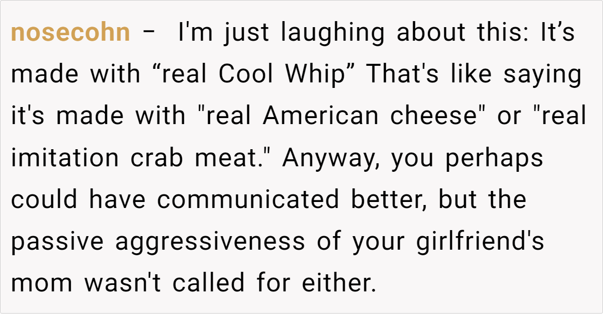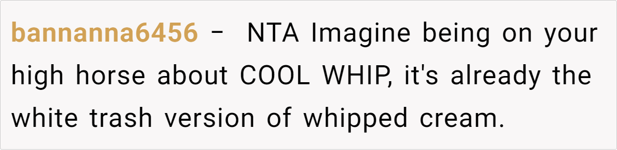 Sometimes the difference between a name brand and its generic counterpart is more about perception than taste. In food science, experts like Harold McGee have pointed out that many processed products are formulated to be very similar, with variations often rooted in marketing rather than substance. In this case, the choice of generic whipped topping over Cool Whip hardly changes the dessert’s outcome—yet it triggered an outsized reaction. This perspective invites us to reconsider whether a product’s label is as critical as the intent behind it.