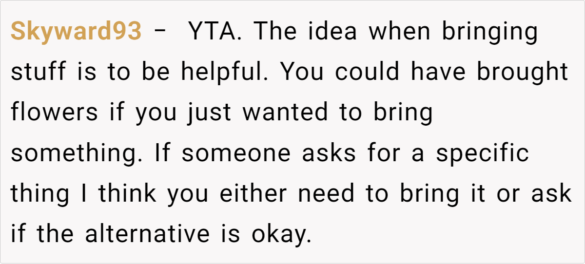 This story encapsulates the delicate dance between following instructions to the letter and adapting to real-life challenges. While the request was clear, unforeseen circumstances led to a substitute that, in most cases, should have been perfectly acceptable. Yet, the incident underscores how even minor missteps can spiral into larger issues when expectations run high. What are your thoughts? How do you handle situations where practical limitations clash with precise requests? Share your experiences and let’s discuss the fine line between brand loyalty and thoughtful contribution.