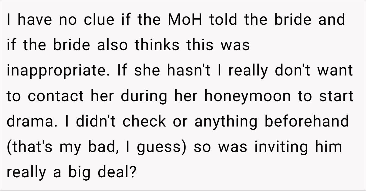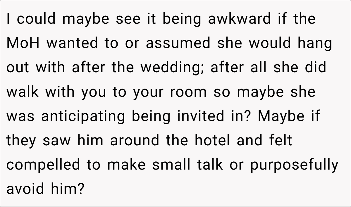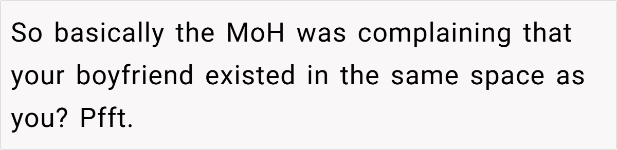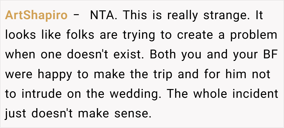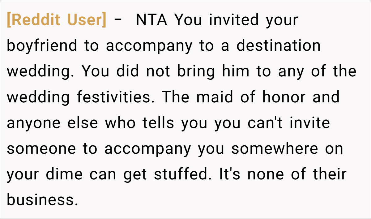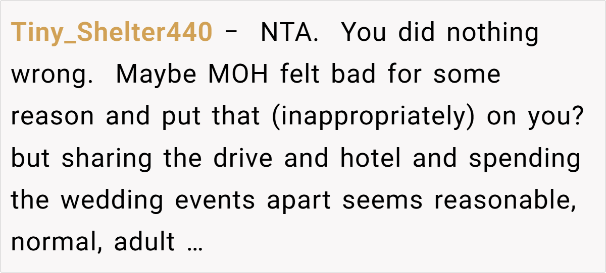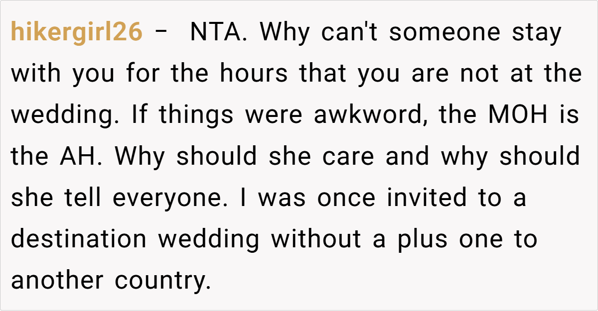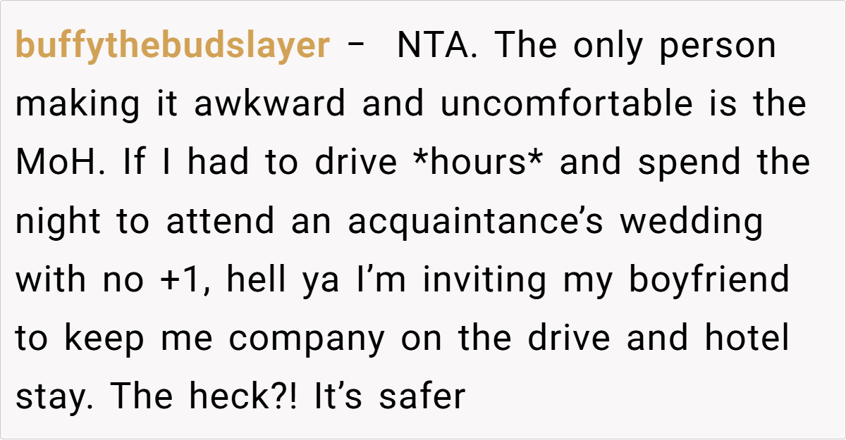 Across Reddit, many users rallied behind the OP’s decision, emphasizing that inviting a travel companion for practical reasons is both logical and mature. They pointed out that if a partner is there solely to share travel burdens—and not to insert themselves into the wedding festivities—it shouldn’t be an issue. Most commenters agreed that the maid of honor’s concerns seemed misplaced, arguing that any temporary awkwardness is trivial compared to the benefits of having safe, shared travel arrangements