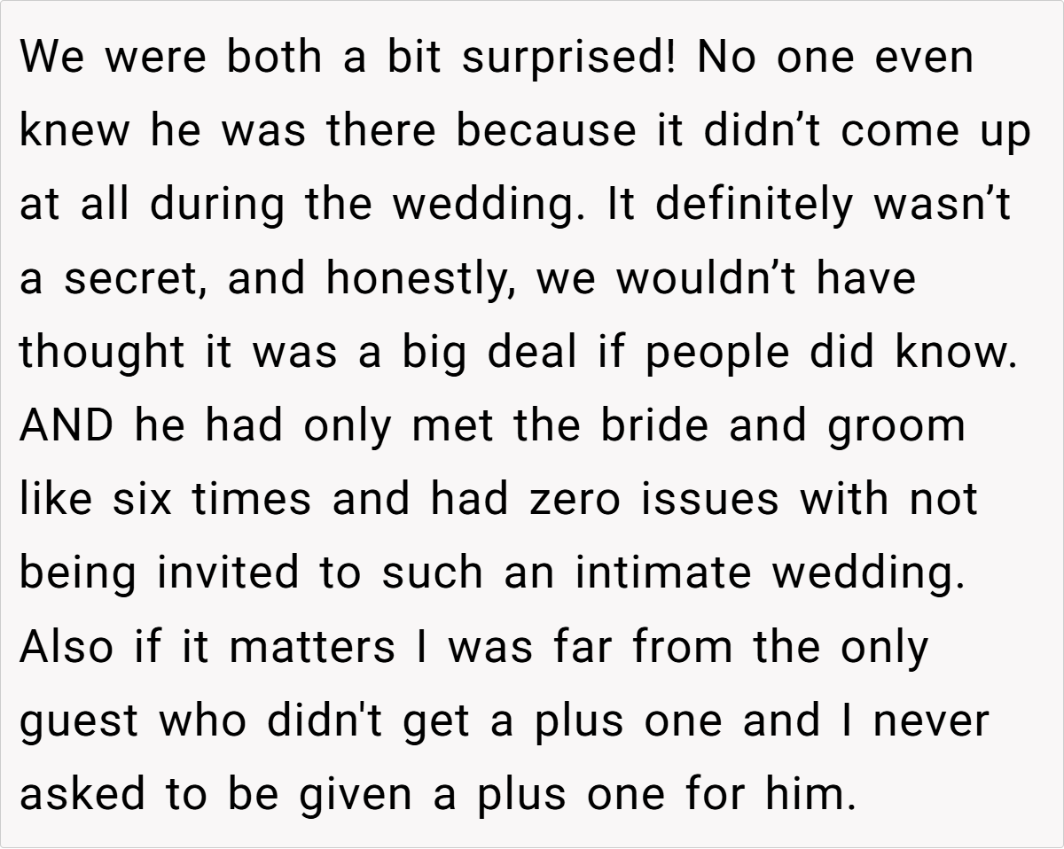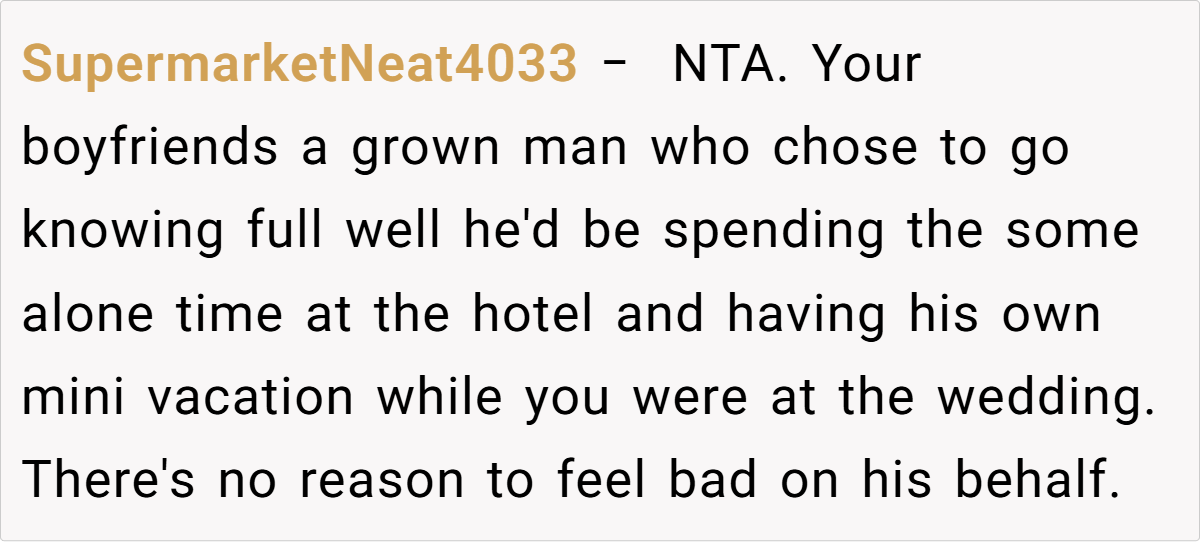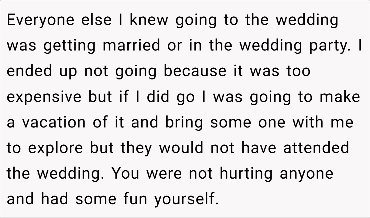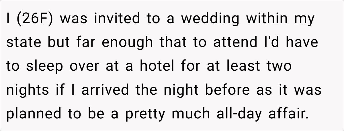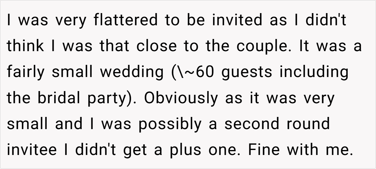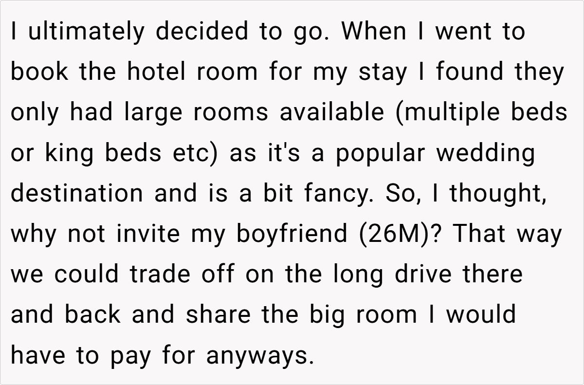 In this case, a 26-year-old guest was delighted to receive an invitation—even without a plus one—and planned to make the most of the trip by booking a hotel for a couple of nights. With a hefty room cost already on the agenda, she saw no harm in inviting her boyfriend along for shared travel duties and a little extra company during downtime.