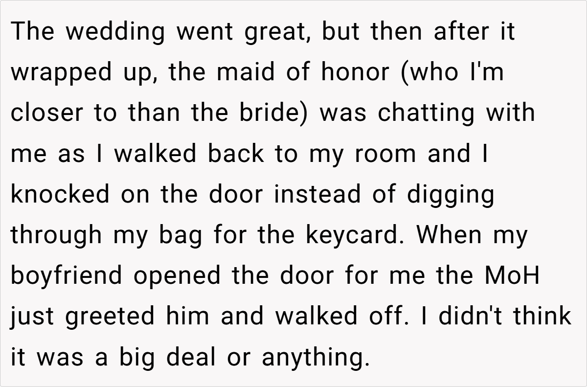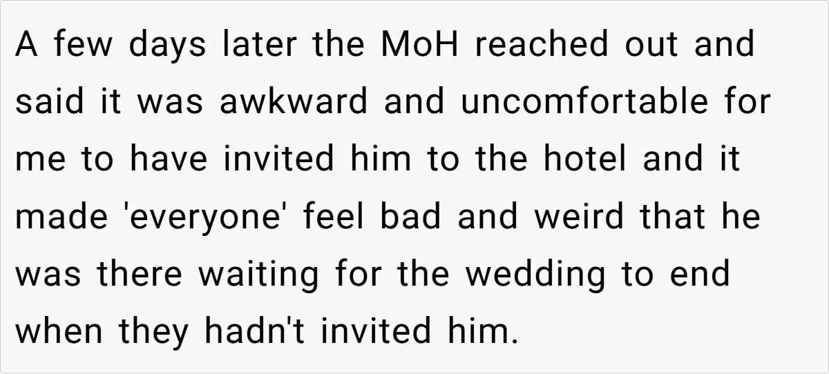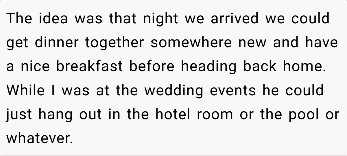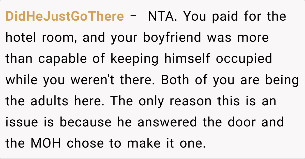 Despite her practical reasoning, things took an unexpected turn. At the wedding, a brief encounter with the maid of honor sparked complaints about his presence in the hotel room, stirring up an awkward debate about what truly belongs on the guest list. This incident raises a compelling question: When does a travel companion become an etiquette issue, and who gets to decide?