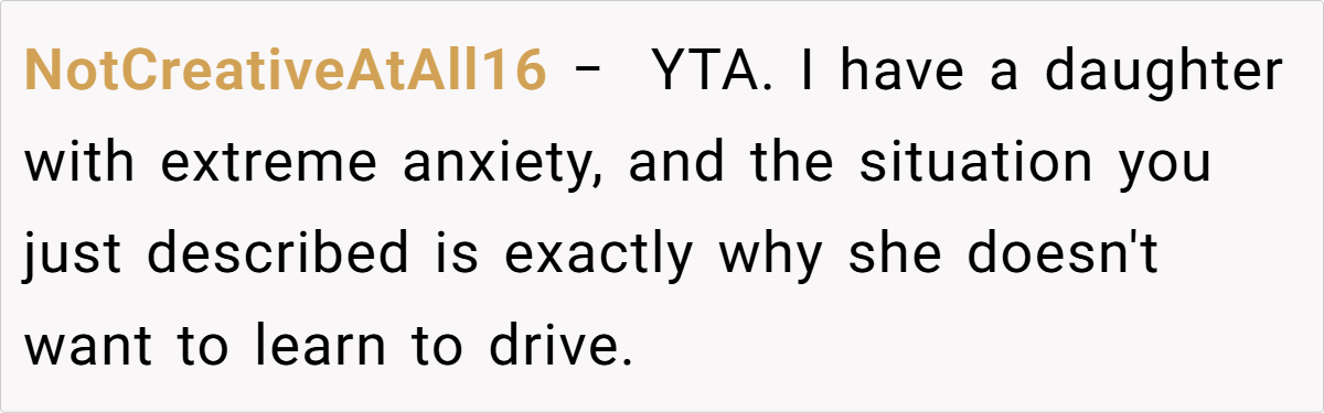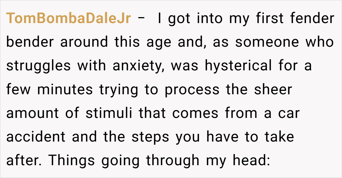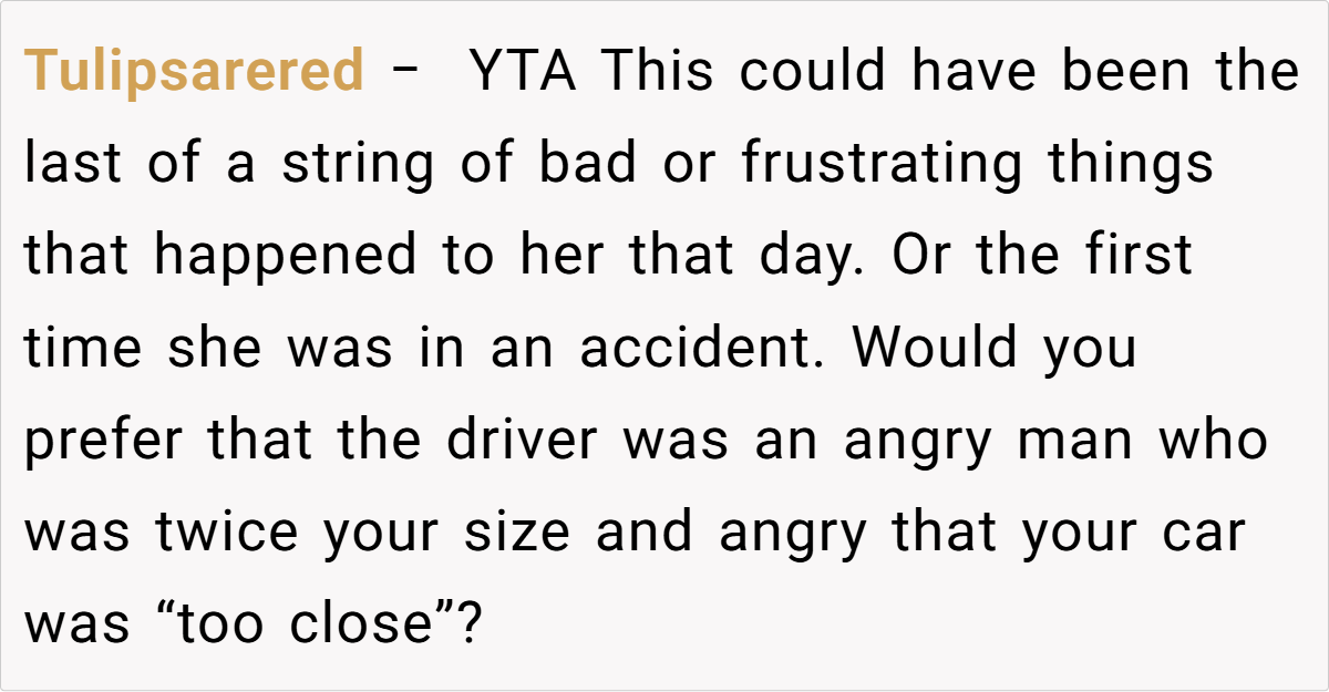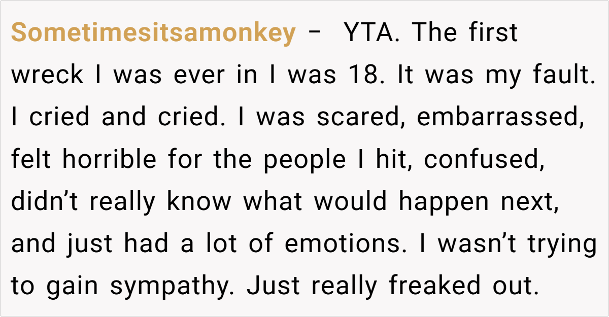 Others, however, emphasized that an inexperienced driver’s emotional outburst likely stemmed from genuine anxiety and fear, urging for a more empathetic approach. Overall, the discussion underscored a common theme: while discipline is important, understanding and compassion are equally vital when dealing with young drivers facing their first serious mistake.