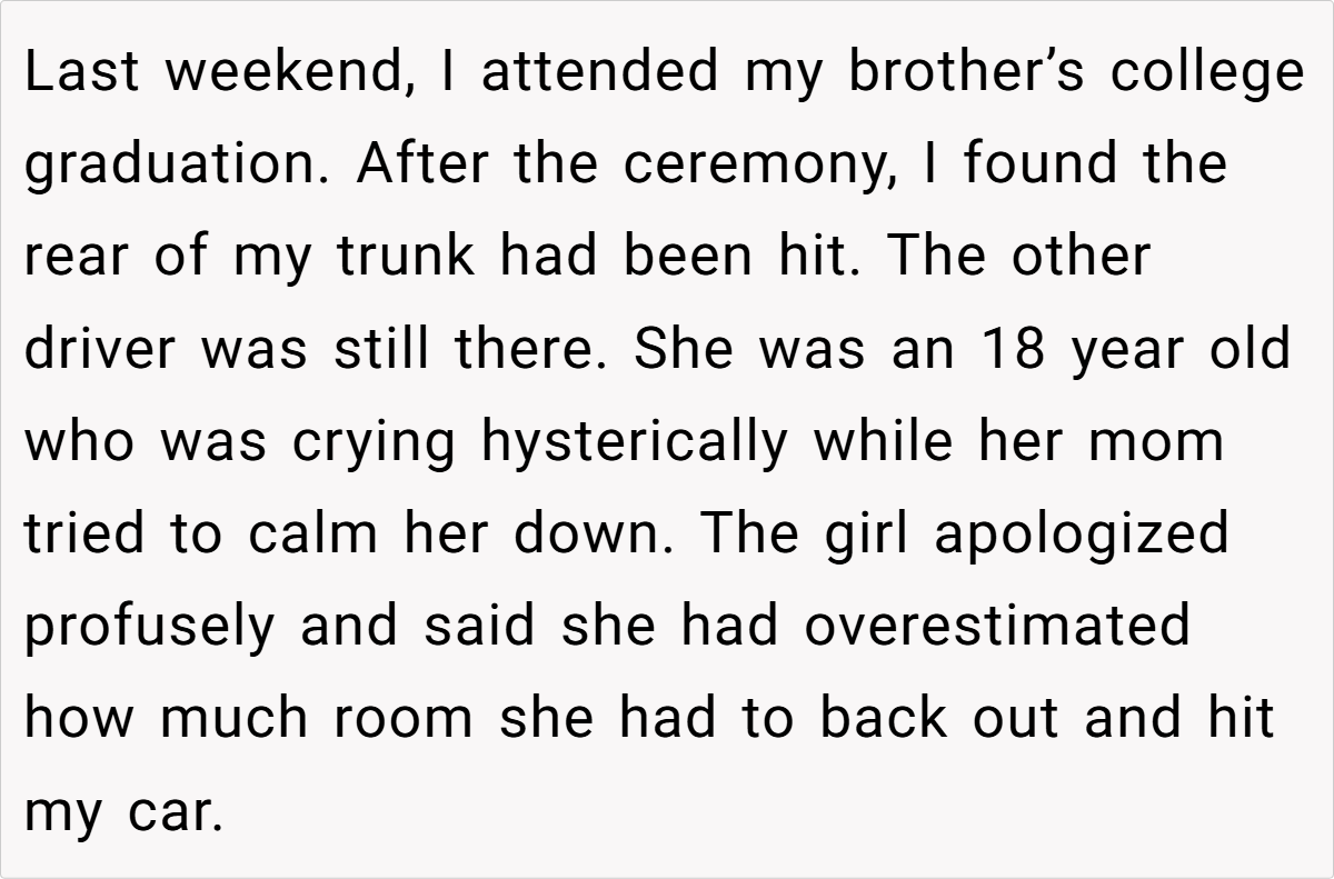 Last weekend, a college graduation celebration took an unexpected twist that left everyone with mixed emotions. Amid the jubilant cheers and proud farewells, I discovered a dent on the rear of my trunk—a remnant of a minor fender bender. The incident involved an 18-year-old driver, visibly overwhelmed and in tears, as her mother tried to soothe her nerves.