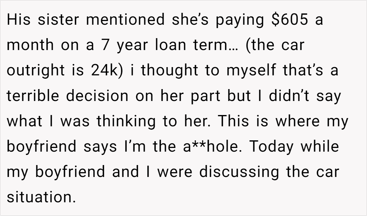 Money talks, and sometimes, it whispers some uncomfortable truths. This redditor found herself in a tricky spot, trying to steer her boyfriend and his sister away from what she perceived as financially disastrous car loans. But did her blunt honesty cross a line? Read the full story below.