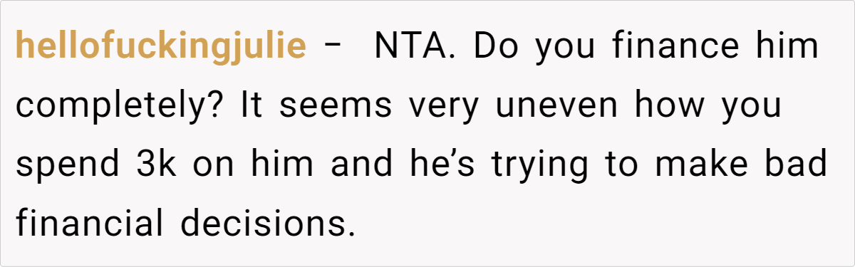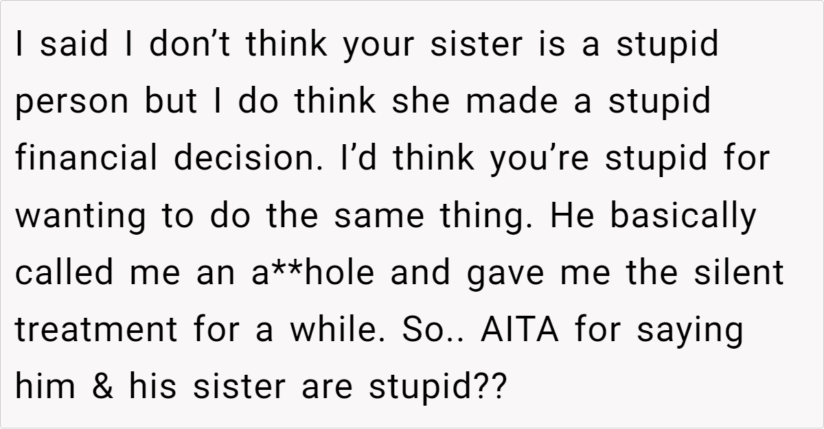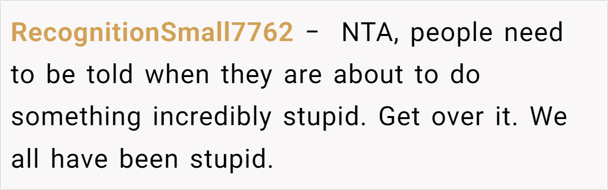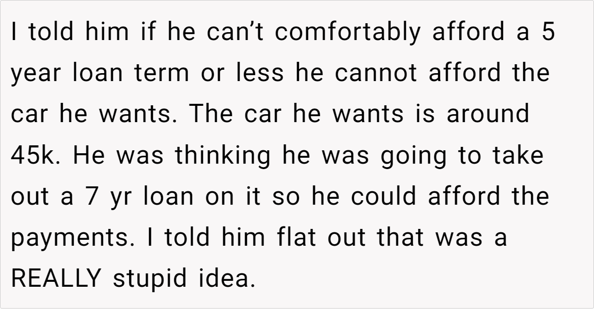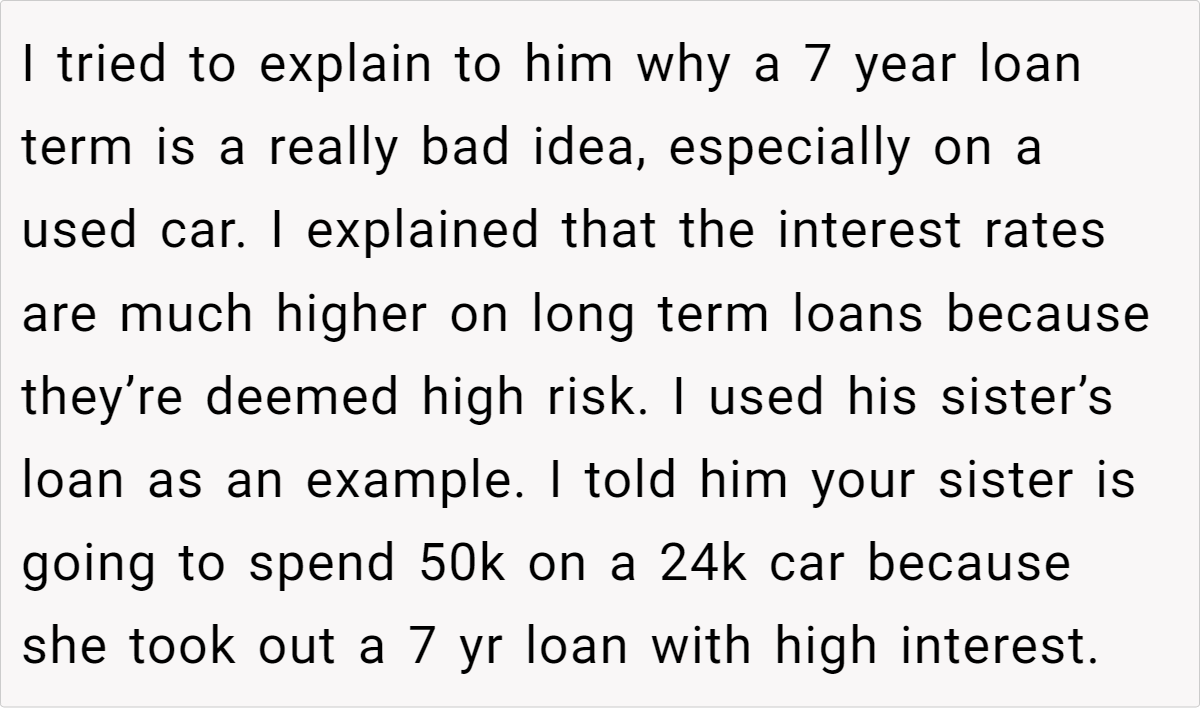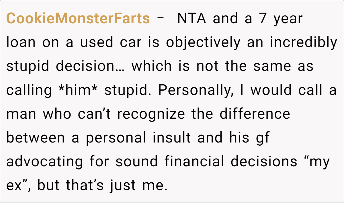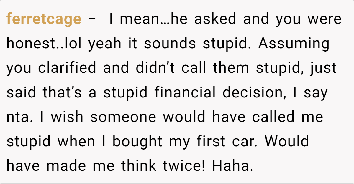 Ultimately, this isn’t just a debate about car loans—it’s a conversation about how financial decisions shape our lives and relationships. The OP’s forthright approach raises important questions about where we draw the line between offering helpful advice and being overly critical. Is it fair to label a financial decision as “stupid” when the stakes are so high?