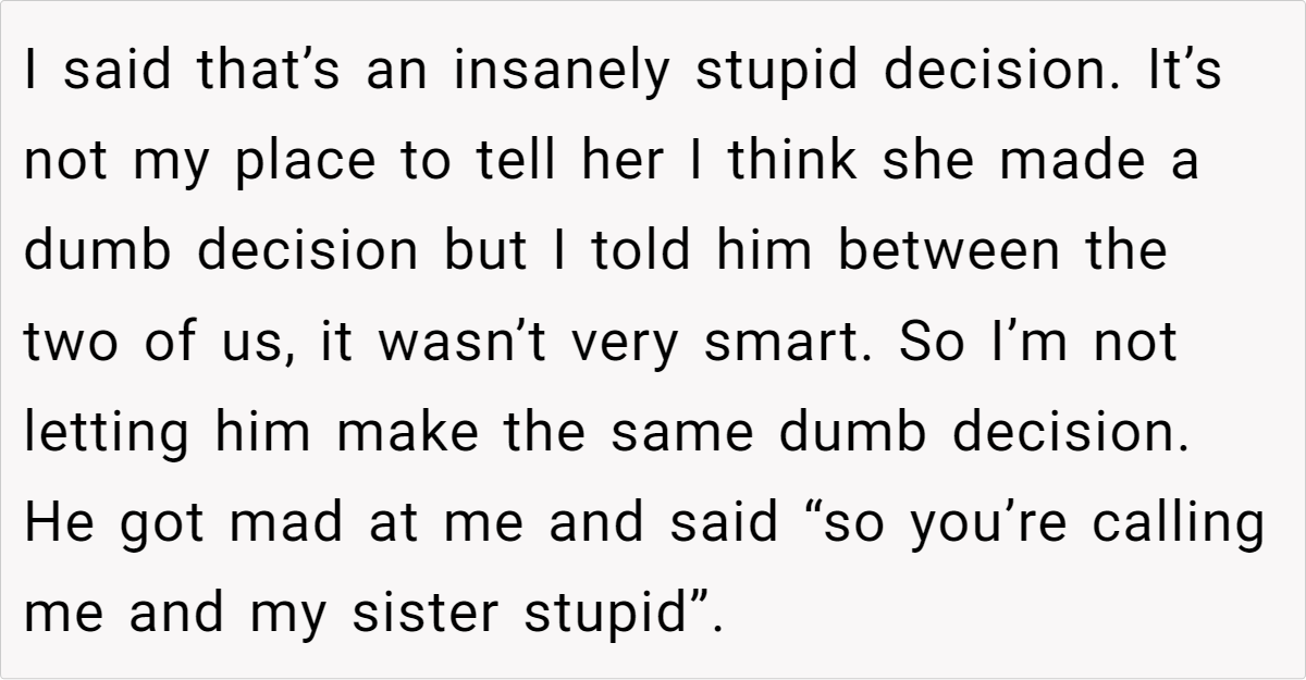 The OP’s approach, while perhaps well-intentioned, could have been perceived as judgmental. While she didn’t explicitly call her boyfriend or his sister “stupid,” her phrasing (“really stupid idea,” “insanely stupid decision”) could certainly be interpreted that way. Her boyfriend’s reaction suggests that he felt attacked and that his intelligence was being questioned.