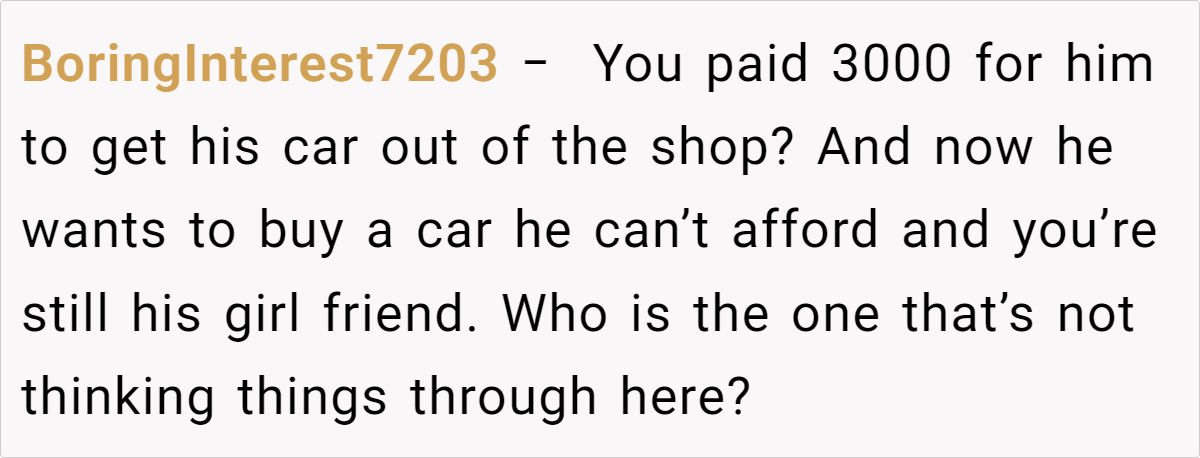 The Reddit community has been quick to chime in on this fiery discussion. Many users agree with the OP, commending her for speaking up against what they see as a recipe for financial disaster. One commenter pointed out, “NTA. A seven-year loan on a used car is objectively an incredibly stupid decision,” while others echoed similar sentiments, emphasizing that such financial missteps can lead to severe long-term consequences. Some even suggested that her boyfriend’s lack of financial literacy might warrant a serious conversation about money management in their relationship.
