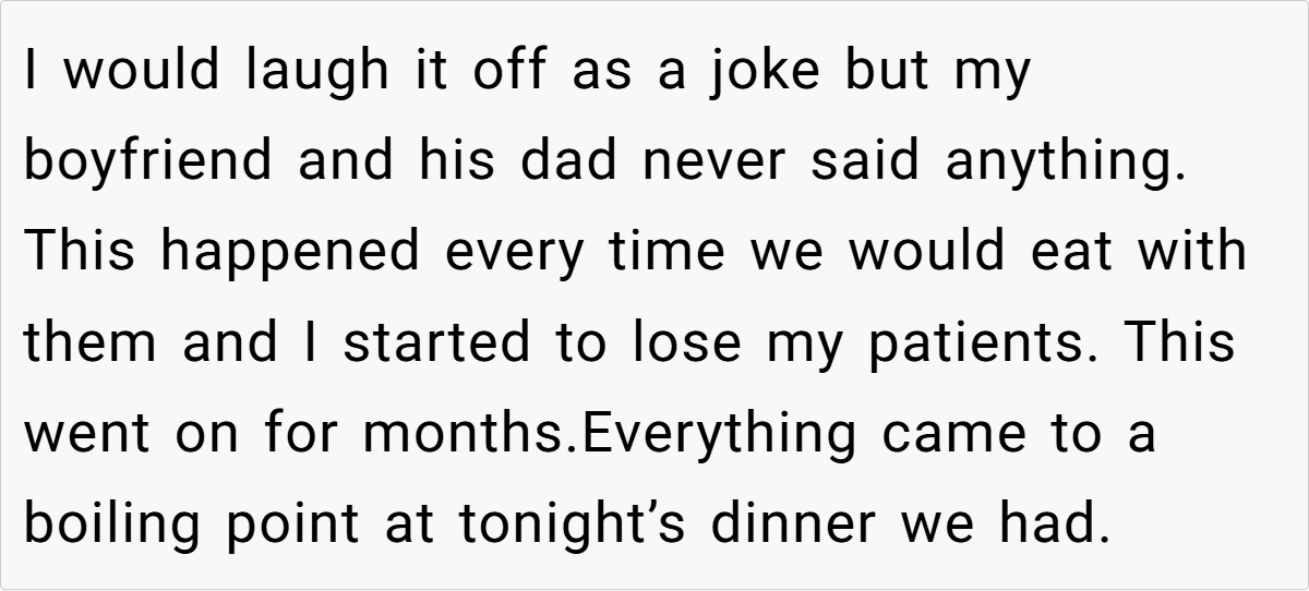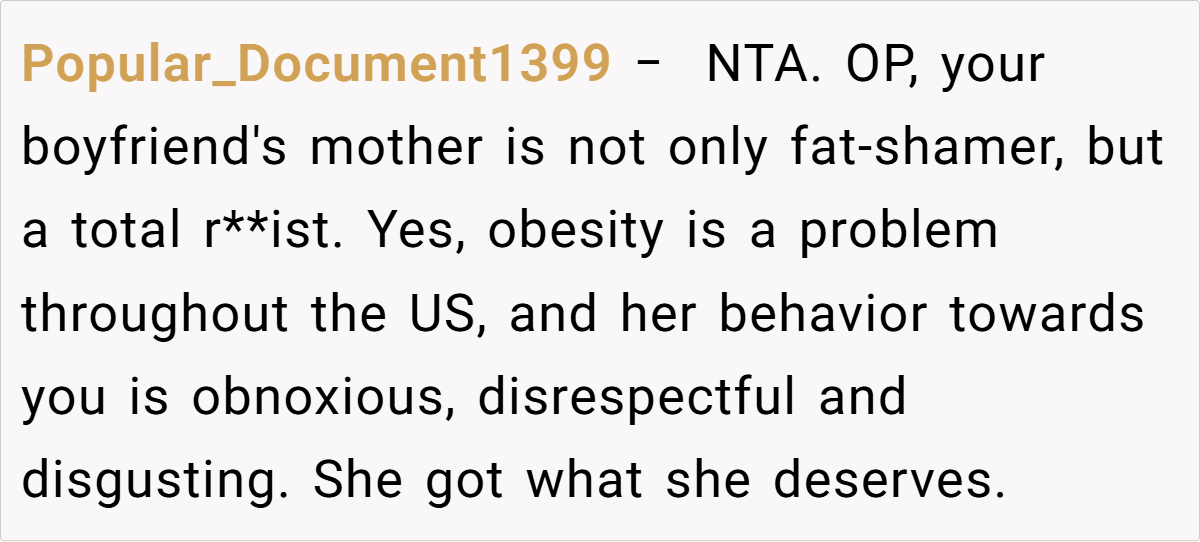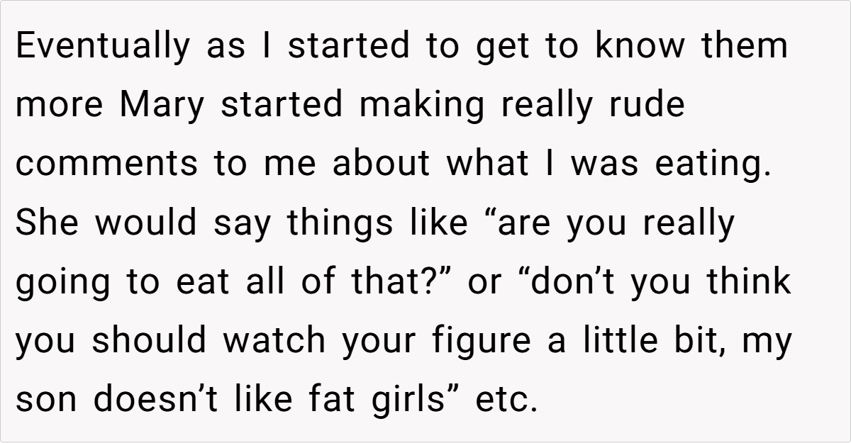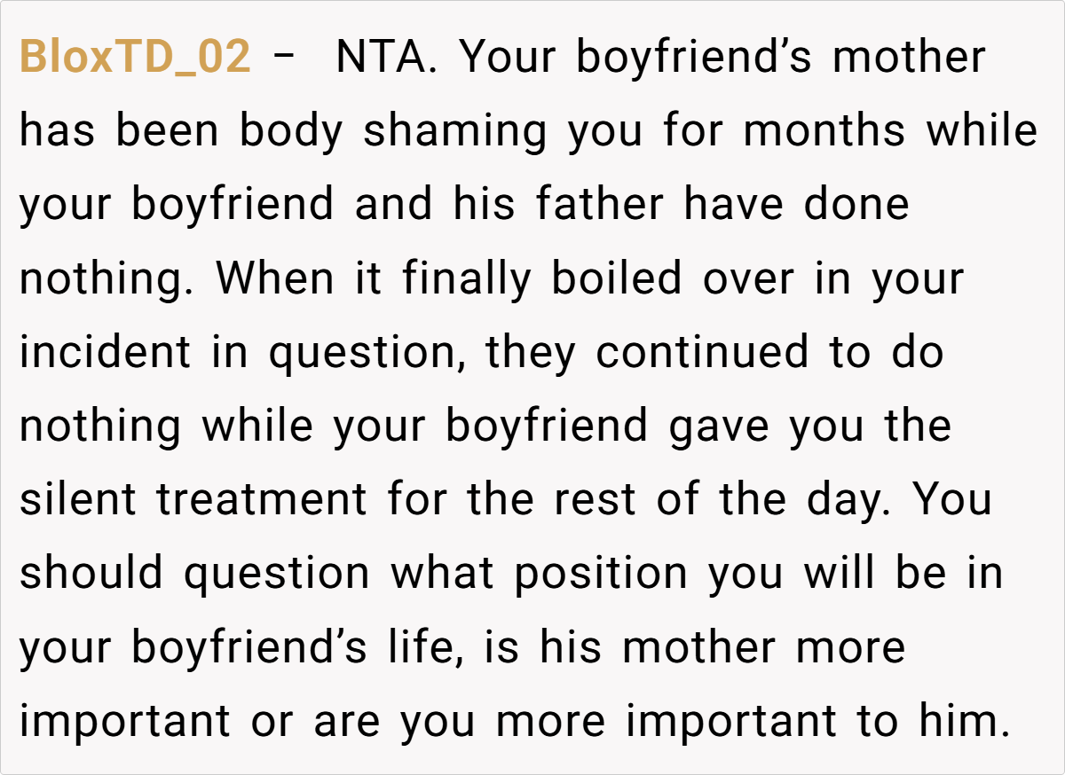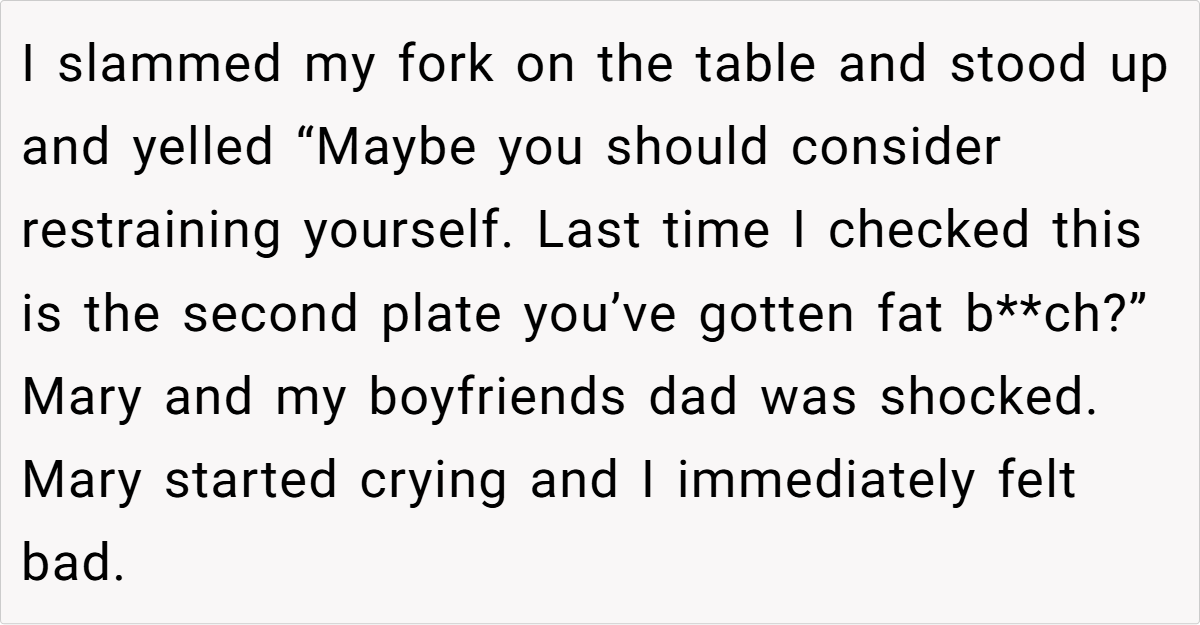 A Reddit user recounts a heated moment at dinner with her boyfriend’s family after enduring months of body-shaming comments from his mother. In a fit of frustration, she snaps back with a harsh comment of her own, leaving the family in shock.