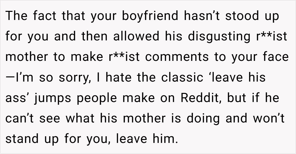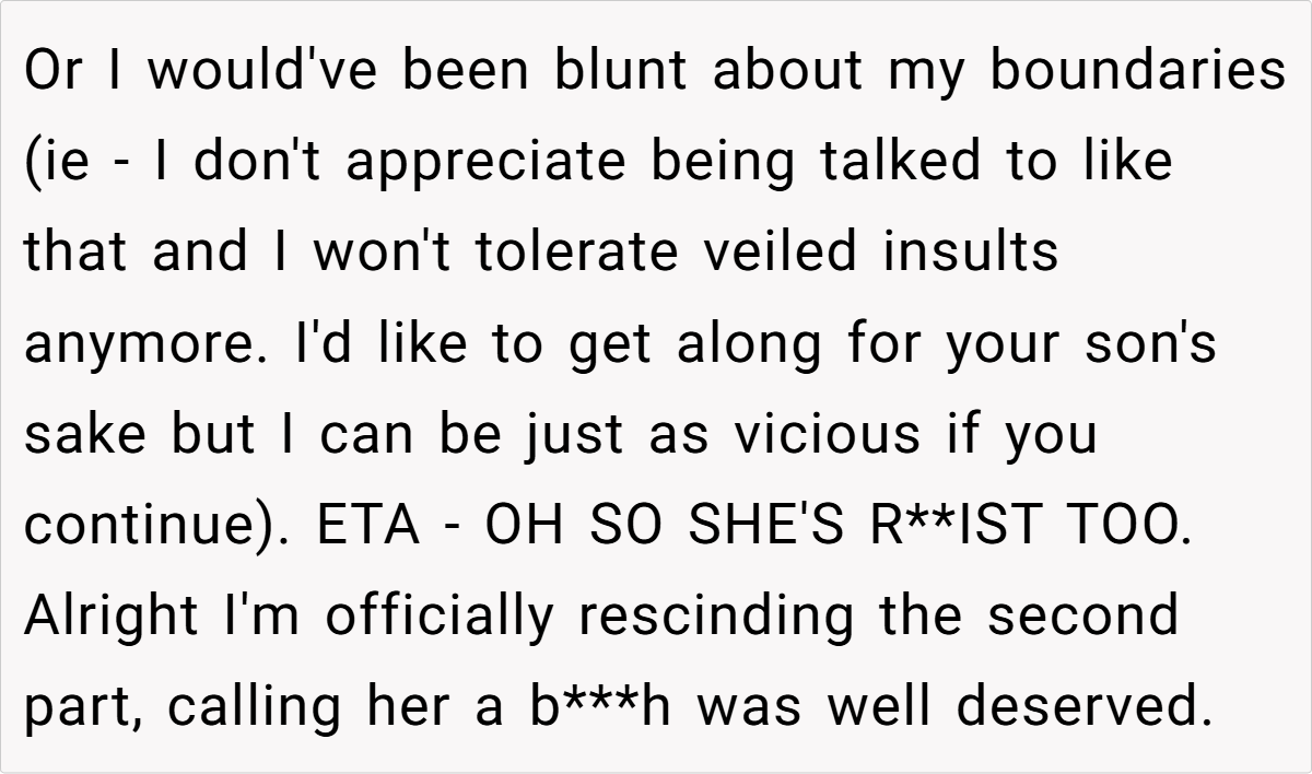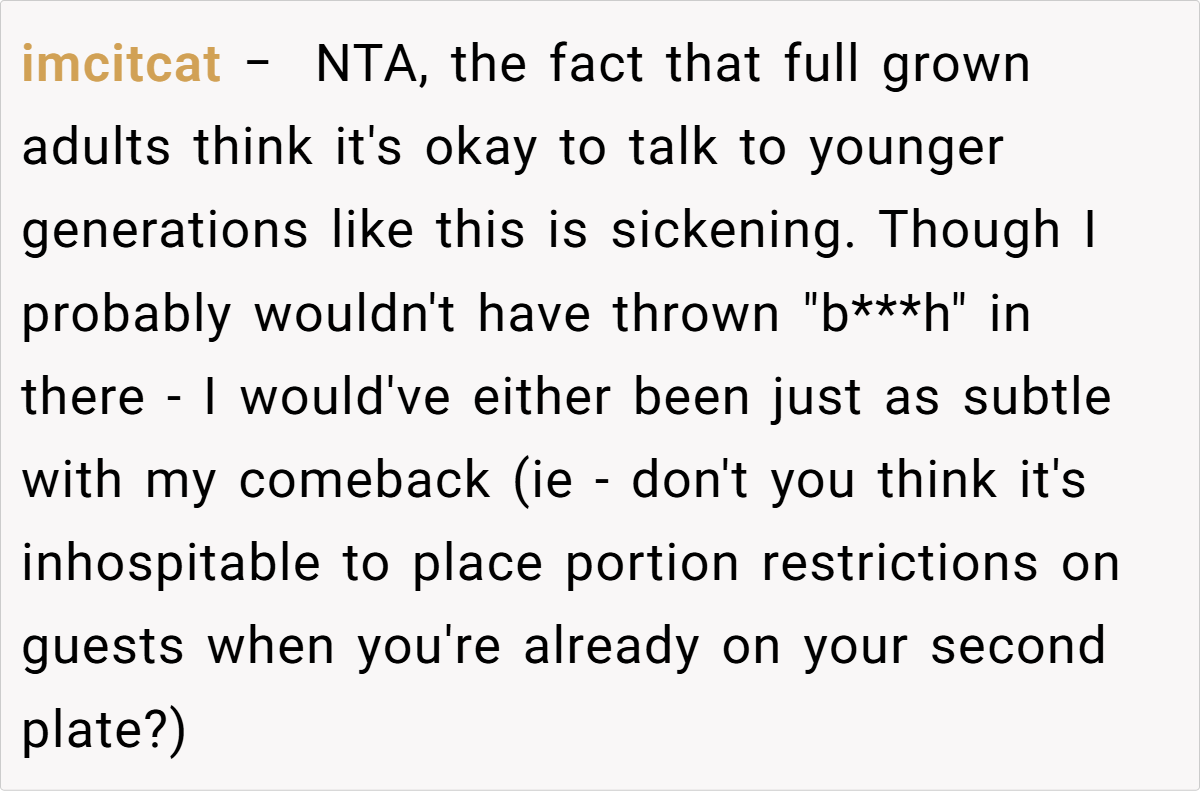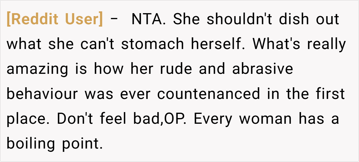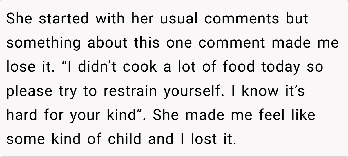 A Reddit user recounts a heated moment at dinner with her boyfriend’s family after enduring months of body-shaming comments from his mother. In a fit of frustration, she snaps back with a harsh comment of her own, leaving the family in shock.