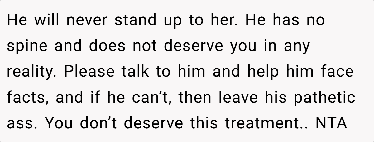 I had lovely but old fashioned mil 99.9 percent time she was fine . There few incidents one was her granddaughters wedding same date as my brothers 18th . Well you can celebrate his birthday anytime . My brother in law his daughters wedding he ah bit of snob Wife born silver spoon n her mouth very rich .If lottie brothers 18th if. She wishes spend day with him or pop in for his celebration up to her don’t ever talk to her that way again . When I met my husband I was 17 lived in horrible flat had £36.15 pw live on so mostly loaf bread tins of beans so very slim . My now husband u can’t stay living here damps horrendous so cold u can see your breath plus your landlady seems think it’s your job as only female hoover clean comunal stairs and take bin bags out for other flats takes piss . Before flat been bnb streets be for that . I was under care of social services this was in Bristol my family in Milton Keynes so no family locally . Then one summer my future mother in law well lottie your putting weight on about size 16/18 you don’t want end up like that lady . There was lady in shorts about size 28/30 as sumone attended all girls school had eating disorder in past if went over 7 stone eat lettuce or cress teaspoon of grated cheese salad cream on top till got back to 7 stone afther female gym teacher prodded me in tummy called me beefy . Tried not show cared but I cud feel tears my husband and me got married when I was 18 stood up for me spoke to her . My mother in law apologised never sed word again despite me putting weight on she passed about 20 yrs ago been married 29yrs now . If my husband hadn’t said anything stood up for me I’d left . This reminds me of my gp he have a go at me and other paitents about lifestyle weight despite himself being seriously overweight just like your mil complete hypocrite your partner sounds like trying avoid conflict . So u have decide can I then why shud I have put up with her remarks .At end day you only only told her truth if she can’t take it she shudnt dish it out x
