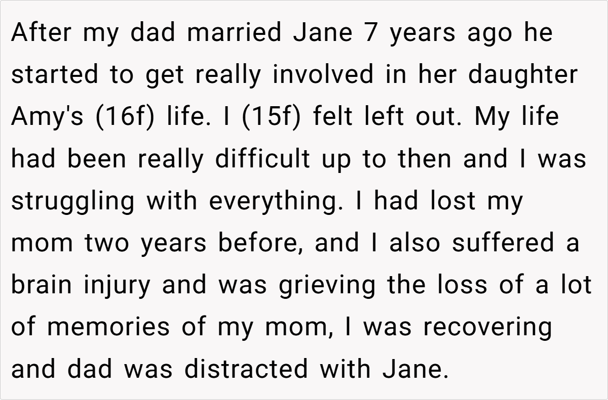 Family dynamics in blended households can be incredibly complex. In this case, the daughter’s sense of neglect stems from her father’s apparent favoritism toward Amy. Her feelings of abandonment are compounded by previous hardships, including the loss of her mother and struggles with a brain injury. Such experiences can leave deep emotional scars, making every instance of perceived rejection feel even more acute.