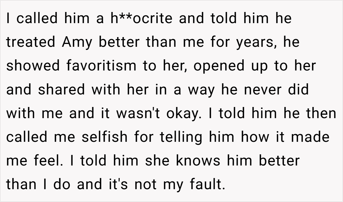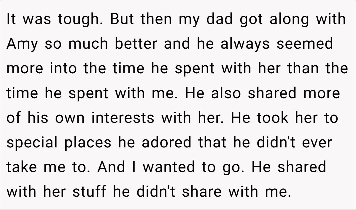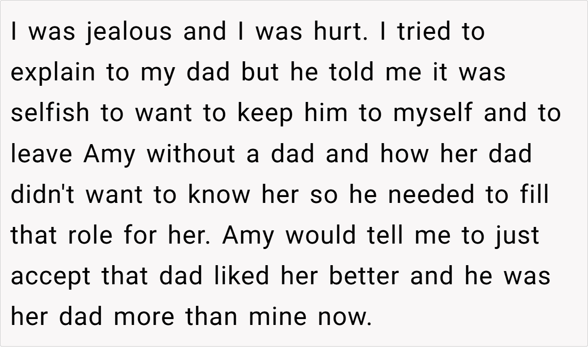 Family relationships are never simple, especially in blended households. In this deeply personal Reddit post, a 15-year-old girl shares her pain over feeling abandoned by her father—who, after remarrying, has clearly favored his stepdaughter, Amy. With a past marked by loss and personal struggle, she finds her father’s dismissive attitude and lack of genuine connection even more hurtful.