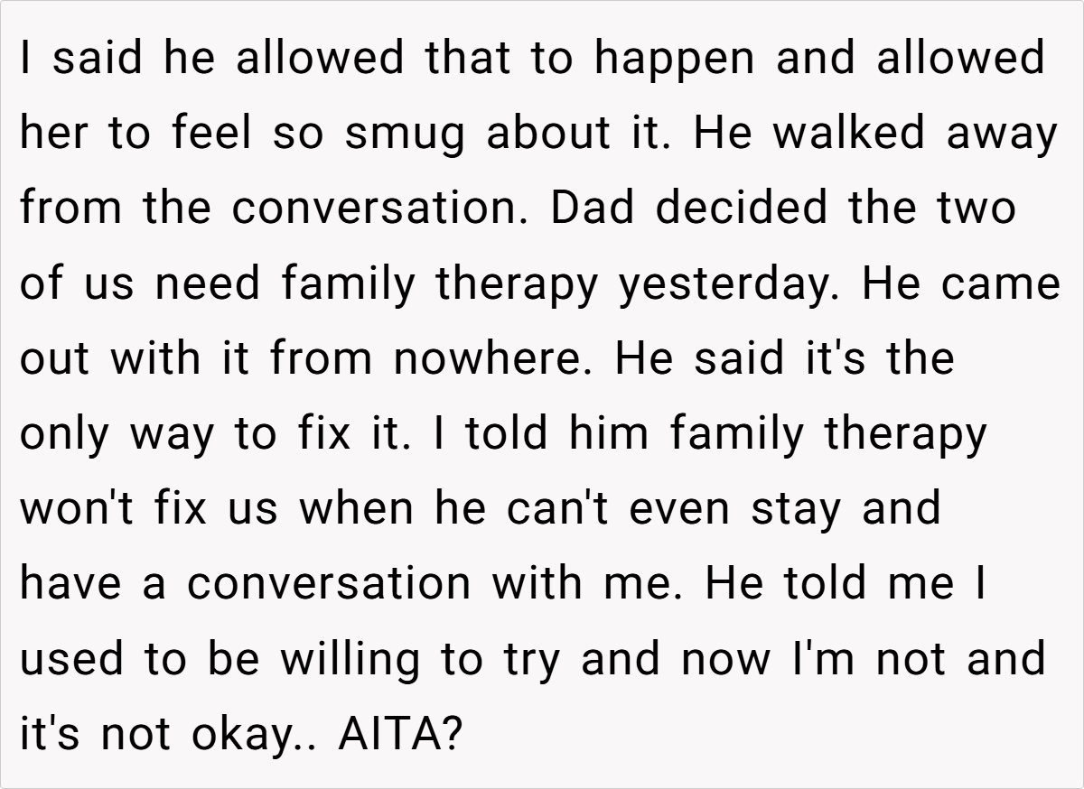 ‘AITA for calling my dad a h**ocrite and telling him family therapy won’t fix us?’