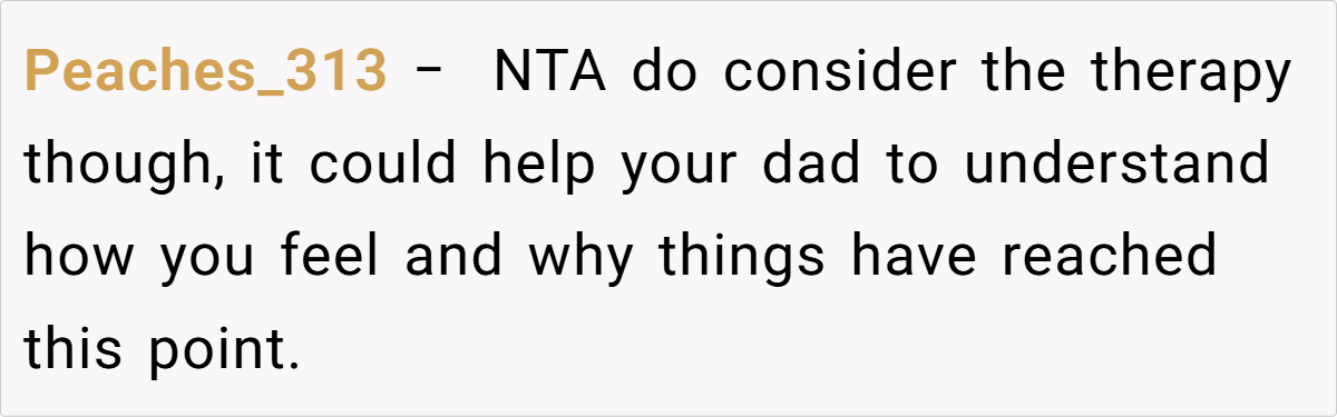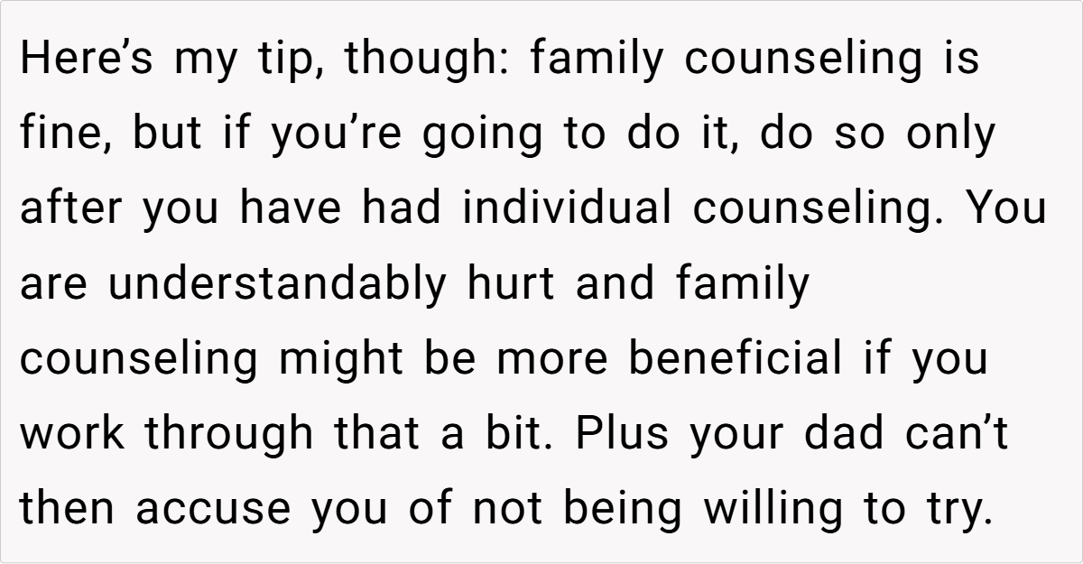 The father’s insistence on family therapy—without first acknowledging his role in creating the rift—only deepens the sense of betrayal. For many, genuine healing begins with honest conversations, not enforced sessions. The daughter’s reaction, though harsh, reflects the raw hurt of years of feeling secondary to a new family dynamic, and it underlines the need for her father to take responsibility for his actions.