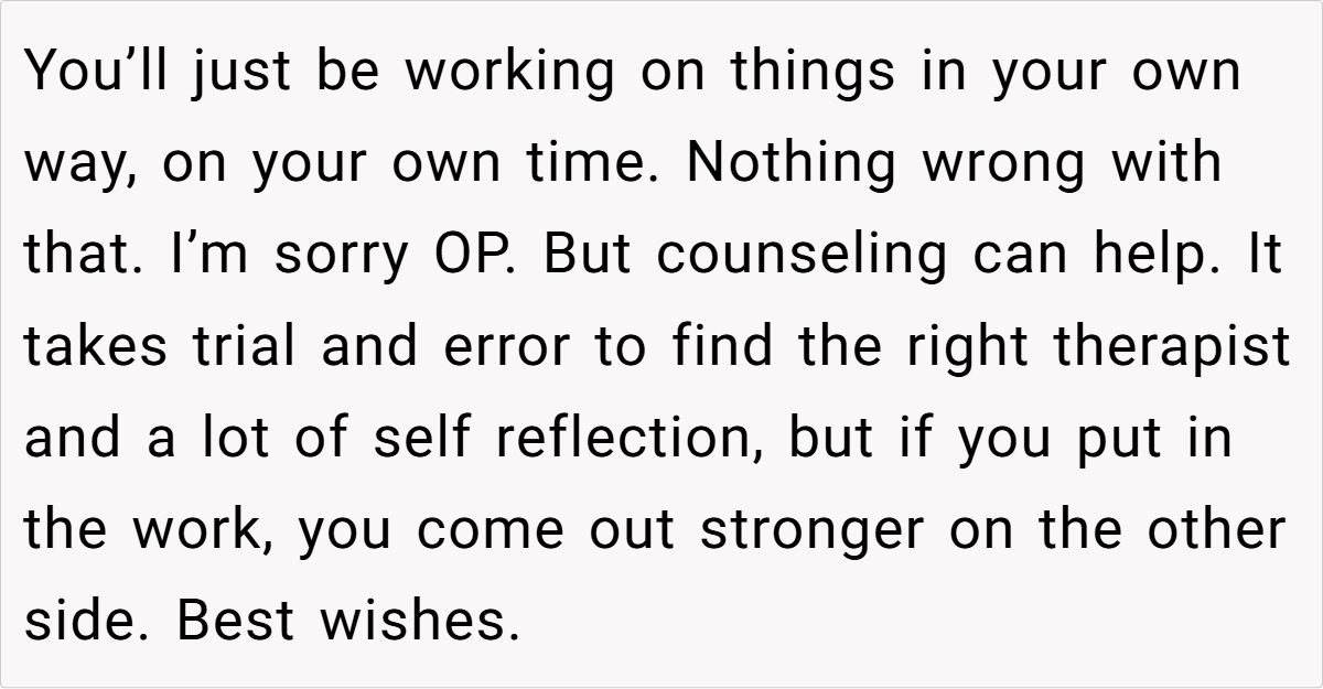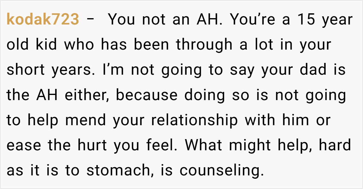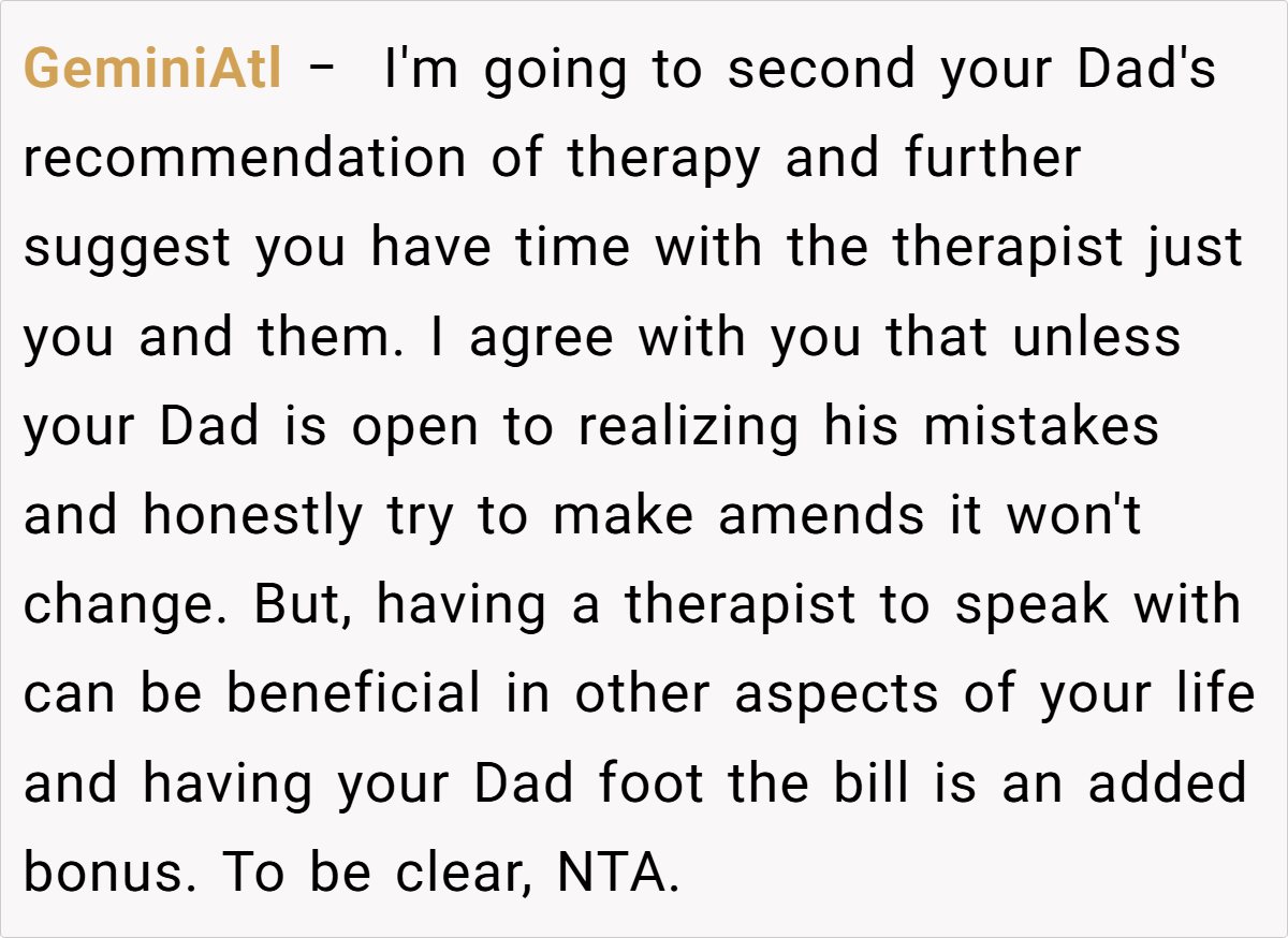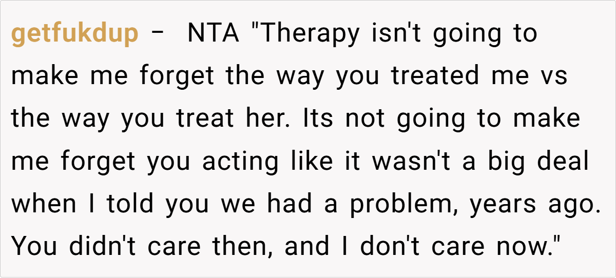 The Reddit community has largely expressed sympathy for the daughter’s feelings. Many commenters label the father’s behavior as manipulative and dismissive, arguing that his insistence on therapy without first addressing the favoritism is both unfair and ineffective. While some suggest that individual counseling might help her process these emotions, the overall consensus is that true healing requires the father to acknowledge and rectify his shortcomings.