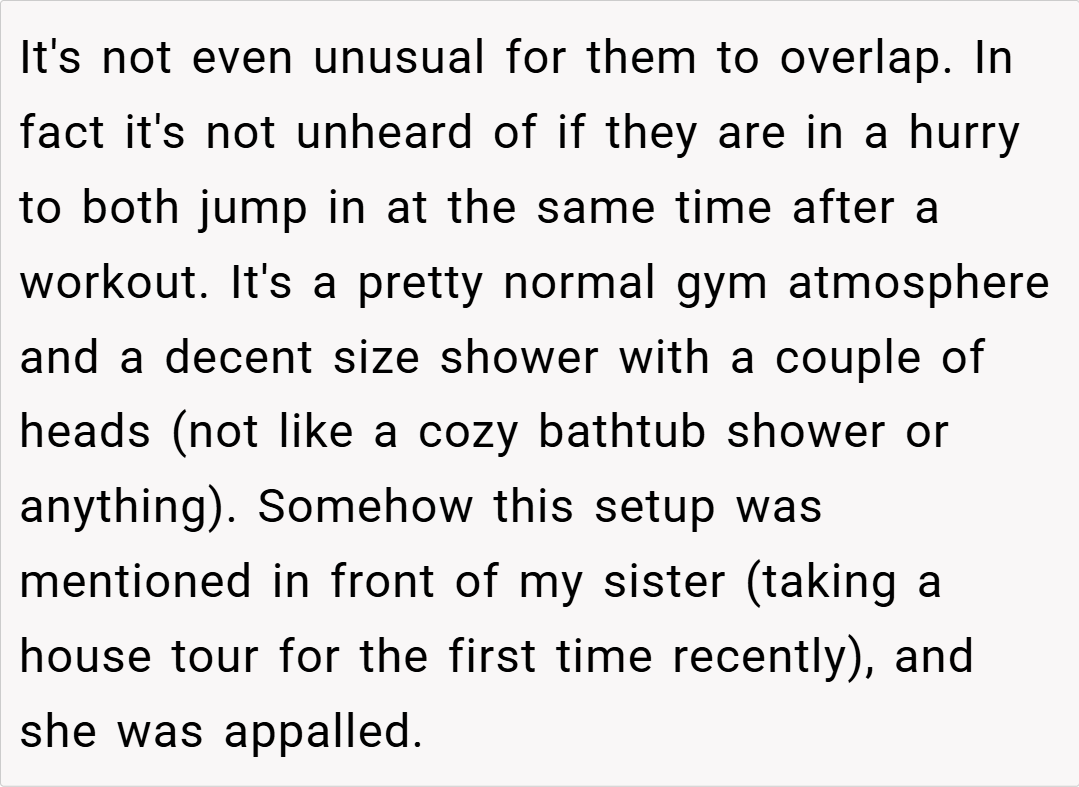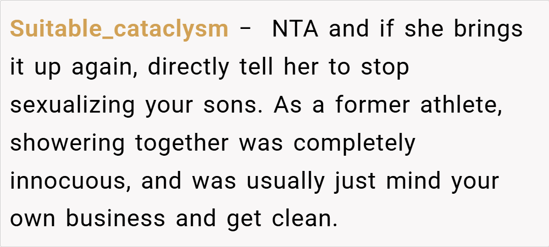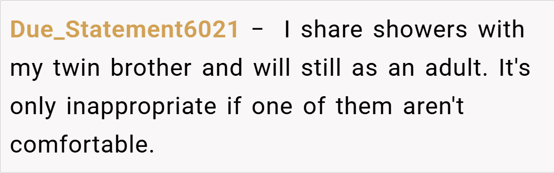 As a dad of two teens aged 17 and 15, the original poster recounts how his sons embrace a locker room–style shower—a practical extension of their active lifestyle. However, his sister’s reaction of shock and labeling their behavior as “inappropriate” has sparked a family feud that questions our evolving views on privacy versus tradition. This tale challenges us to reflect on what is truly normal in today’s dynamic world.