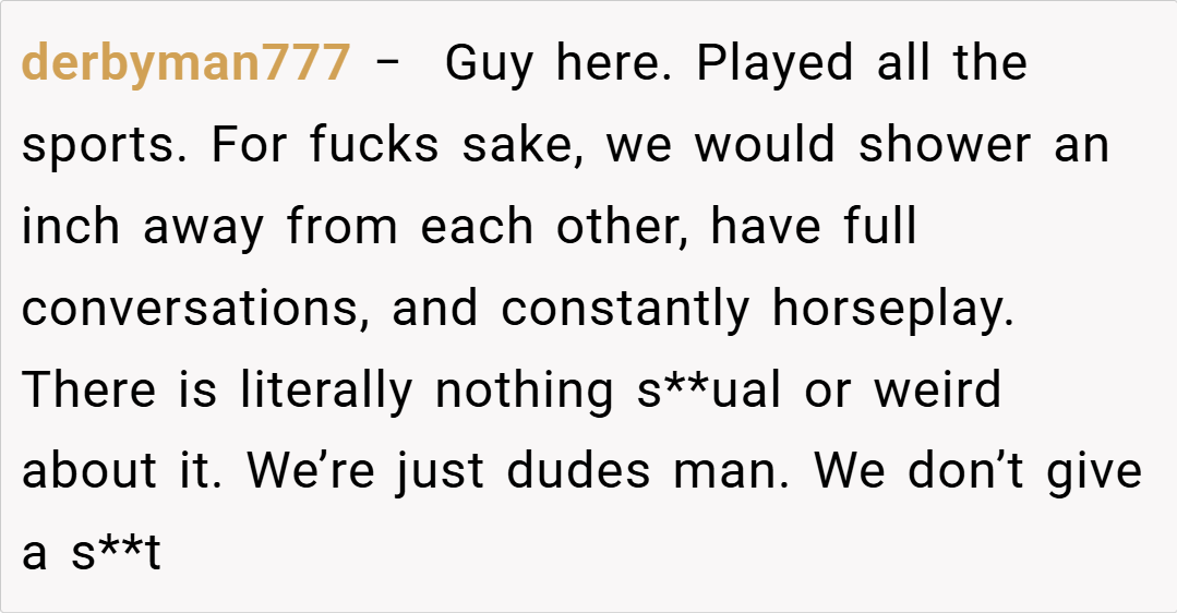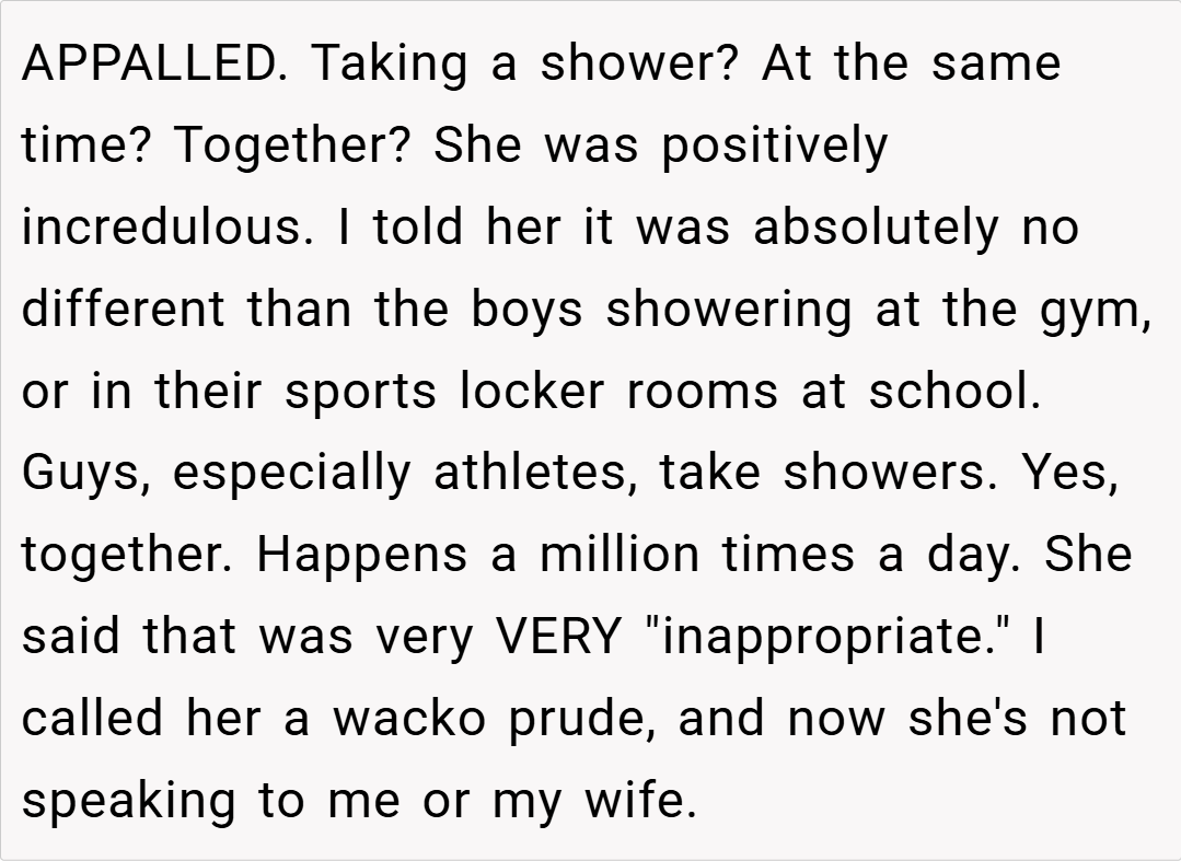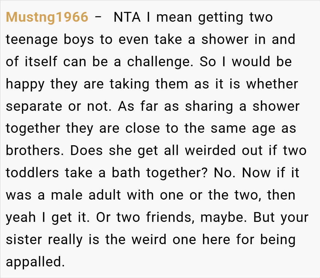 Letting teenage boys share a shower can feel as natural as the refreshing rush after a hard workout. In many school gyms and sports locker rooms, communal showers are an everyday routine. The OP draws a clear parallel between his sons’ experience and that of young athletes who rely on shared spaces after rigorous practice. His perspective emphasizes that these practices are about efficiency and bonding—not about crossing any boundaries.